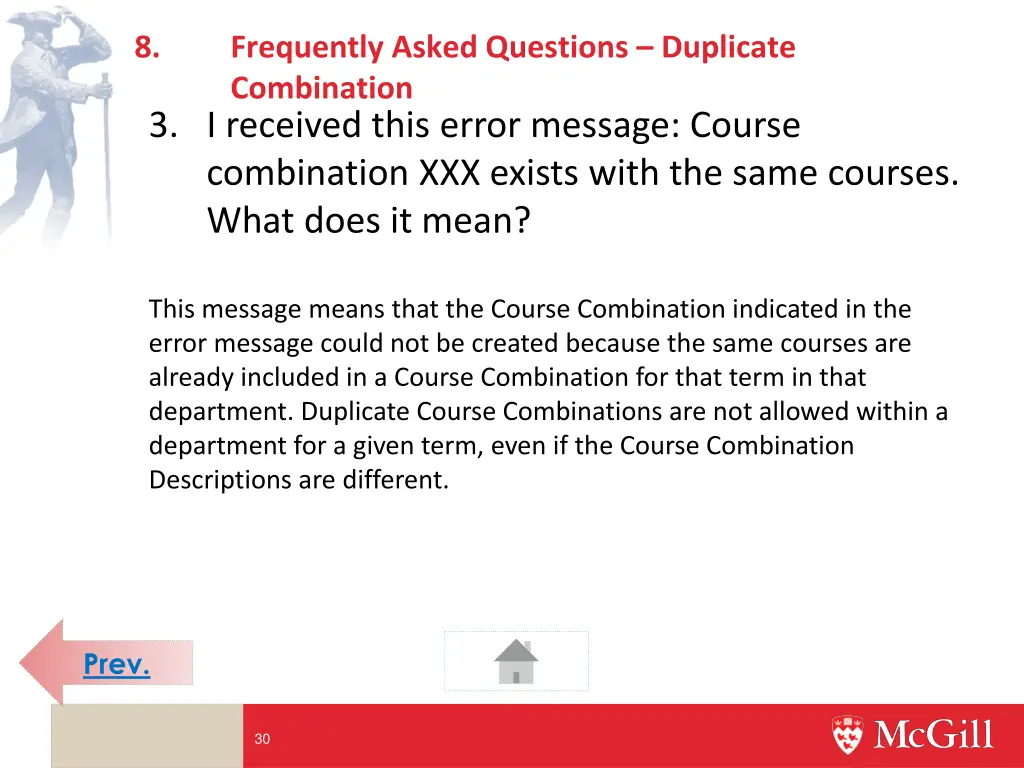 8. Frequently Asked Questions Duplicate Combination 3. I received this error message: Course combination XXX exists with the same courses. What does it mean? This message means that the Course Combination indicated in the error message could not be created because the same courses are already included in a Course Combination for that term in that department. Duplicate Course Combinations are not allowed within a department for a given term, even if the Course Combination Descriptions are different. Prev. 30