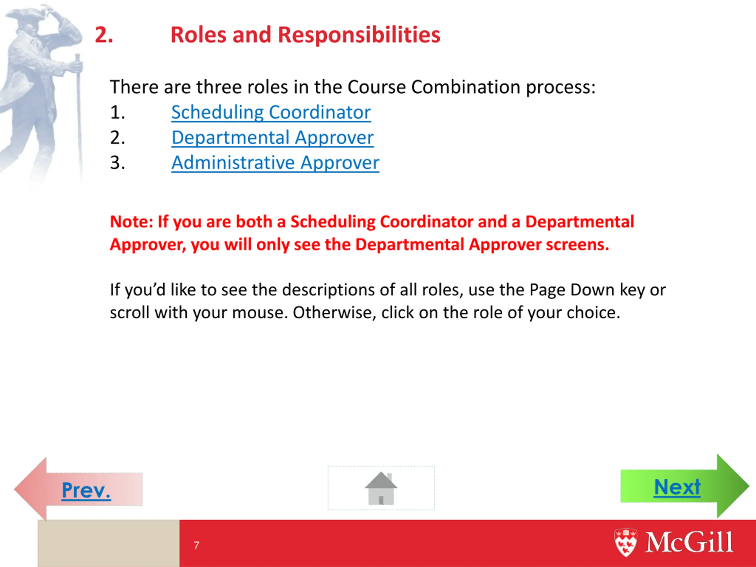 2. Roles and Responsibilities There are three roles in the Course Combination process: 1. Scheduling Coordinator 2. Departmental Approver 3. Administrative Approver Note: If you are both a Scheduling Coordinator and a Departmental Approver, you will only see the Departmental Approver screens. If you d like to see the descriptions of all roles, use the Page Down key or scroll with your mouse. Otherwise, click on the role of your choice. Next Prev. 7