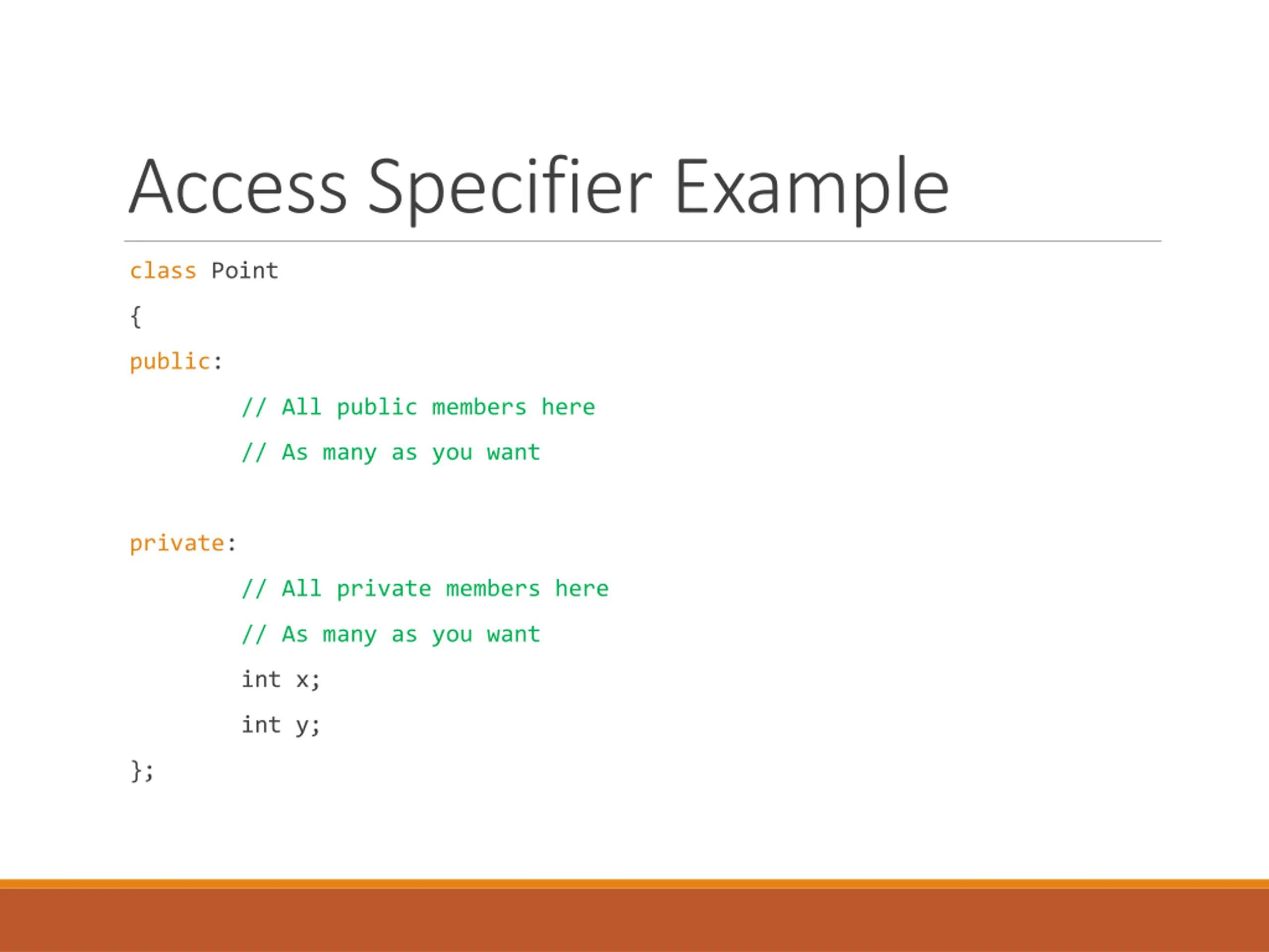 Access Specifier Example class Point { public: // All public members here // As many as you want private: // All private members here // As many as you want int x; int y; };