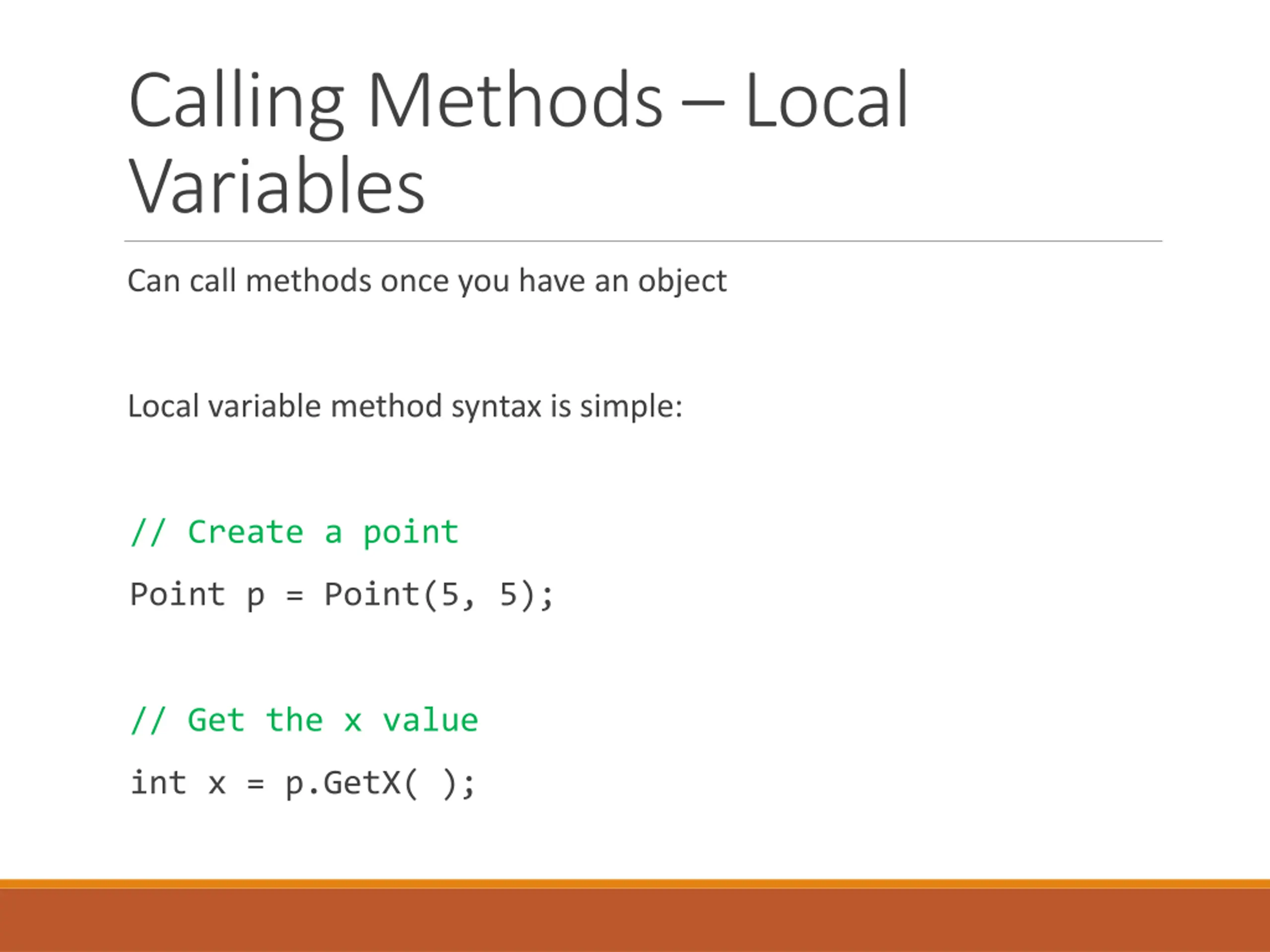 Calling Methods Local Variables Can call methods once you have an object Local variable method syntax is simple: // Create a point Point p = Point(5, 5); // Get the x value int x = p.GetX( );