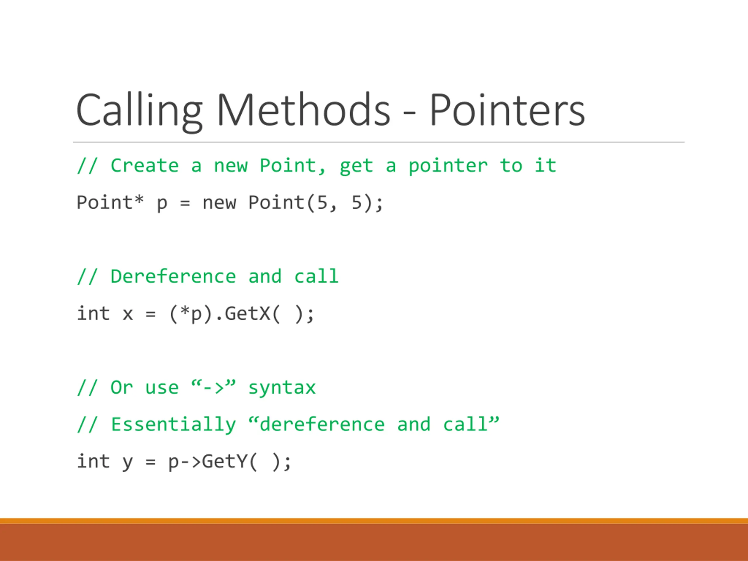 Calling Methods - Pointers Not as straight-forward Can t call a method on a memory address Must dereference first, then call method Or use the arrow operator: ->