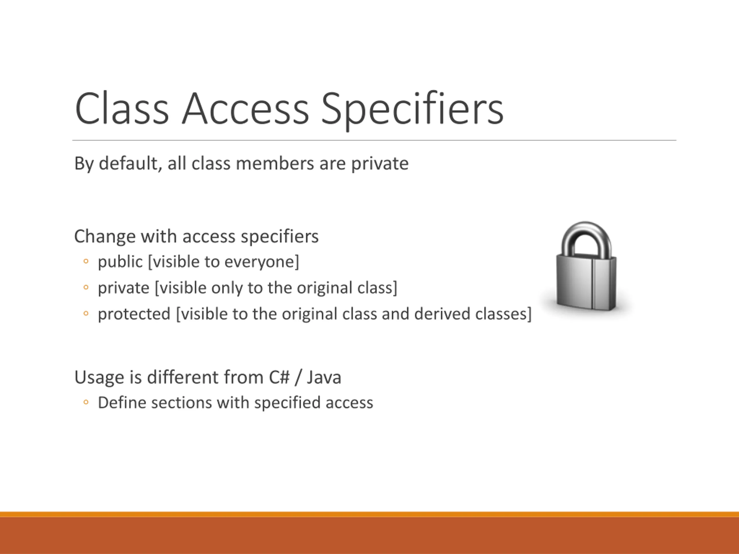 Class Access Specifiers By default, all class members are private Change with access specifiers public [visible to everyone] private [visible only to the original class] protected [visible to the original class and derived classes] Usage is different from C# / Java Define sections with specified access