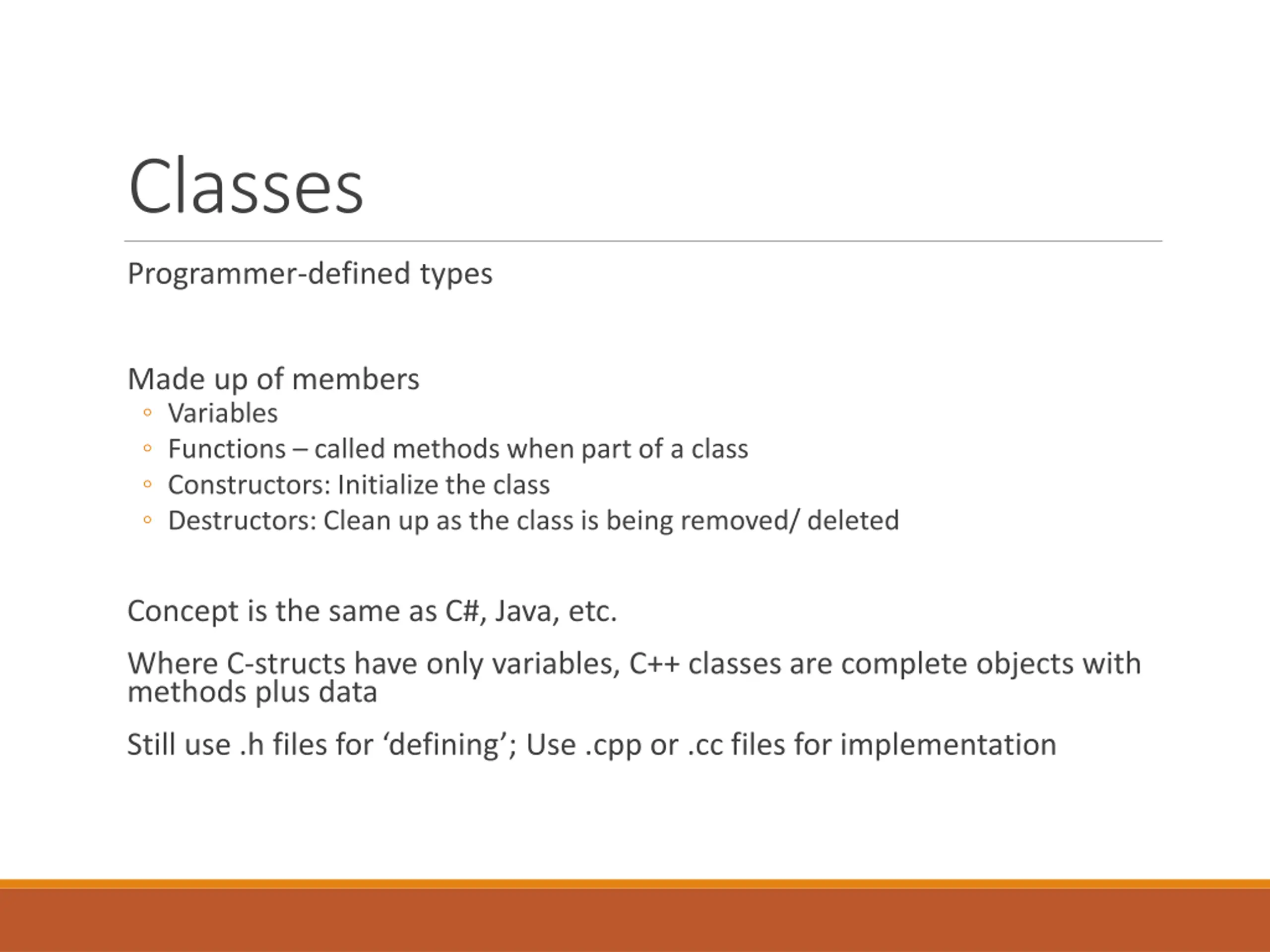 Classes Programmer-defined types Made up of members Variables Functions called methods when part of a class Constructors: Initialize the class Destructors: Clean up as the class is being removed/ deleted Concept is the same as C#, Java, etc. Where C-structs have only variables, C++ classes are complete objects with methods plus data Still use .h files for defining ; Use .cpp or .cc files for implementation