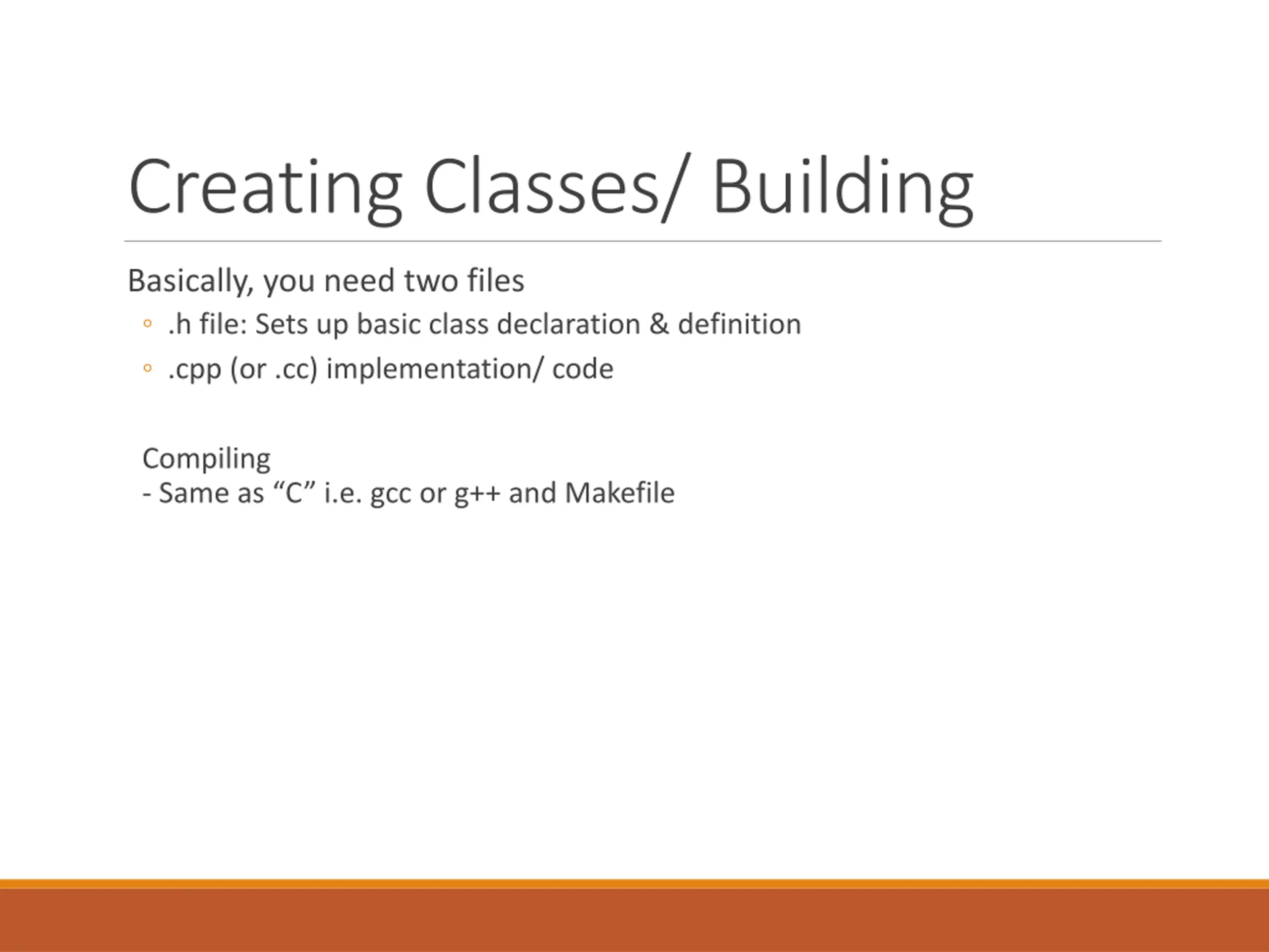 Creating Classes/ Building Basically, you need two files .h file: Sets up basic class declaration & definition .cpp (or .cc) implementation/ code Compiling - Same as C i.e. gcc or g++ and Makefile
