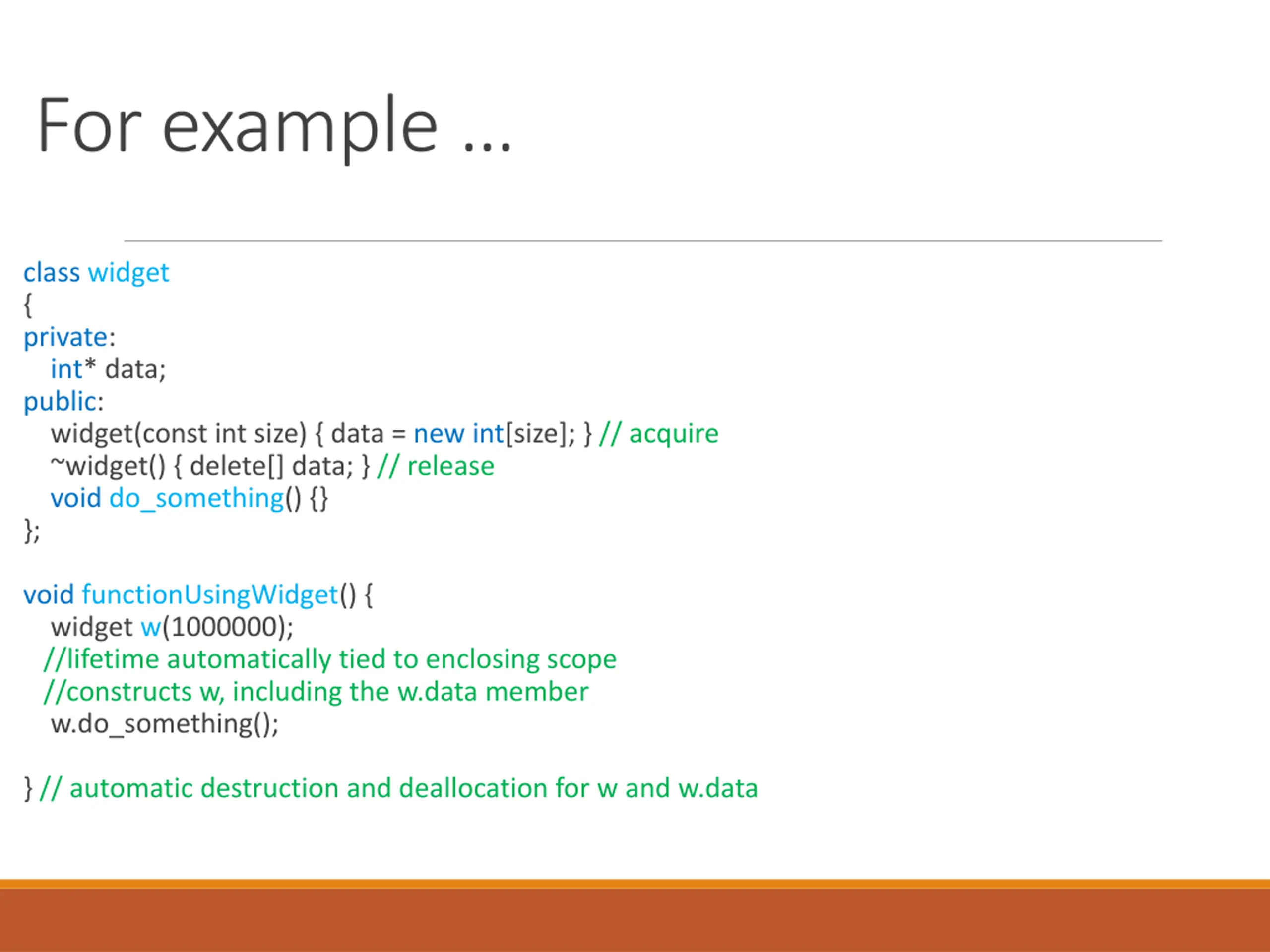 For example class widget { private: int* data; public: widget(const int size) { data = new int[size]; } // acquire ~widget() { delete[] data; } // release void do_something() {} }; void functionUsingWidget() { widget w(1000000); //lifetime automatically tied to enclosing scope //constructs w, including the w.data member w.do_something(); } // automatic destruction and deallocation for w and w.data