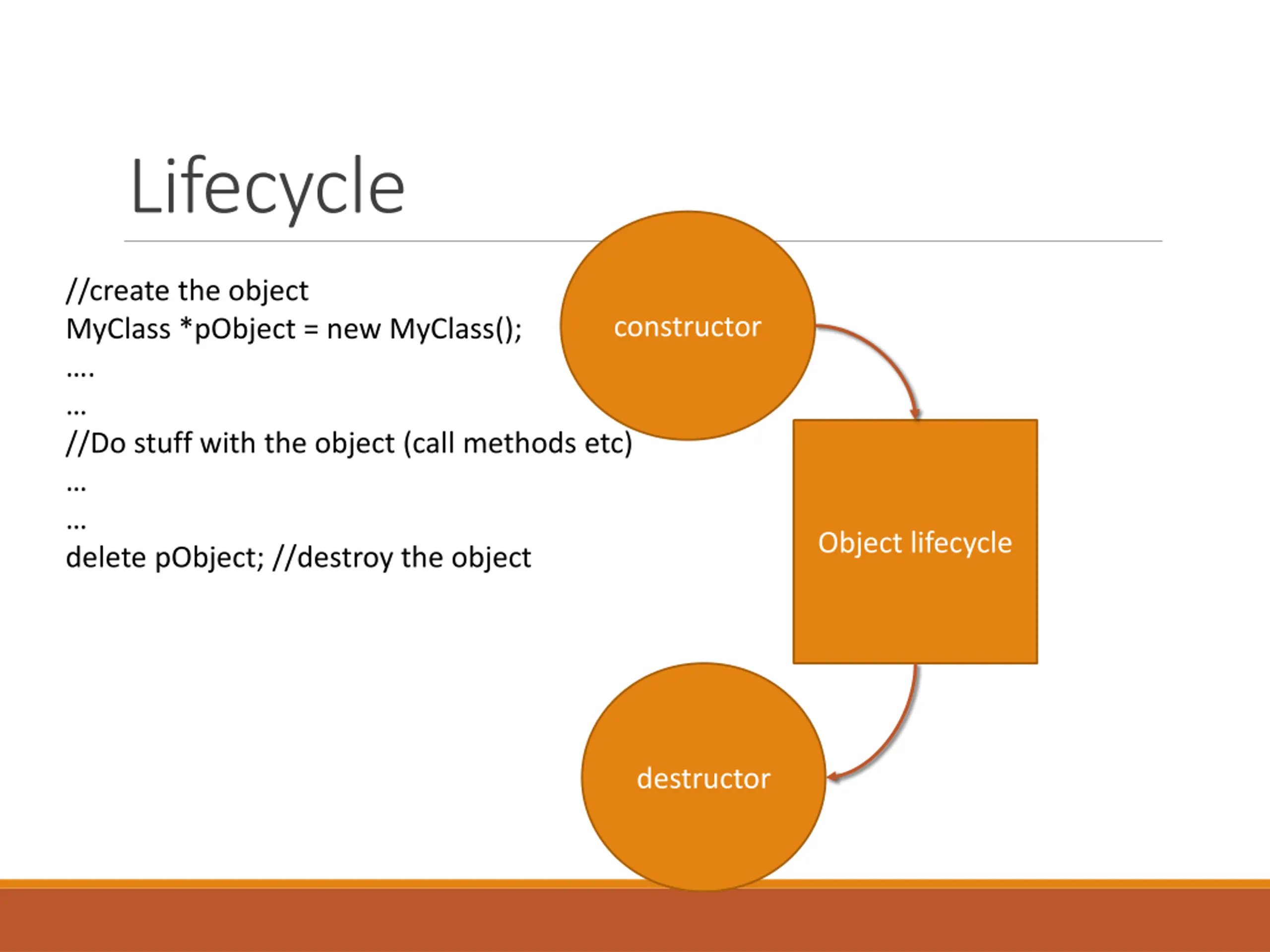 Lifecycle //create the object MyClass *pObject = new MyClass(); . //Do stuff with the object (call methods etc) delete pObject; //destroy the object constructor Object lifecycle destructor