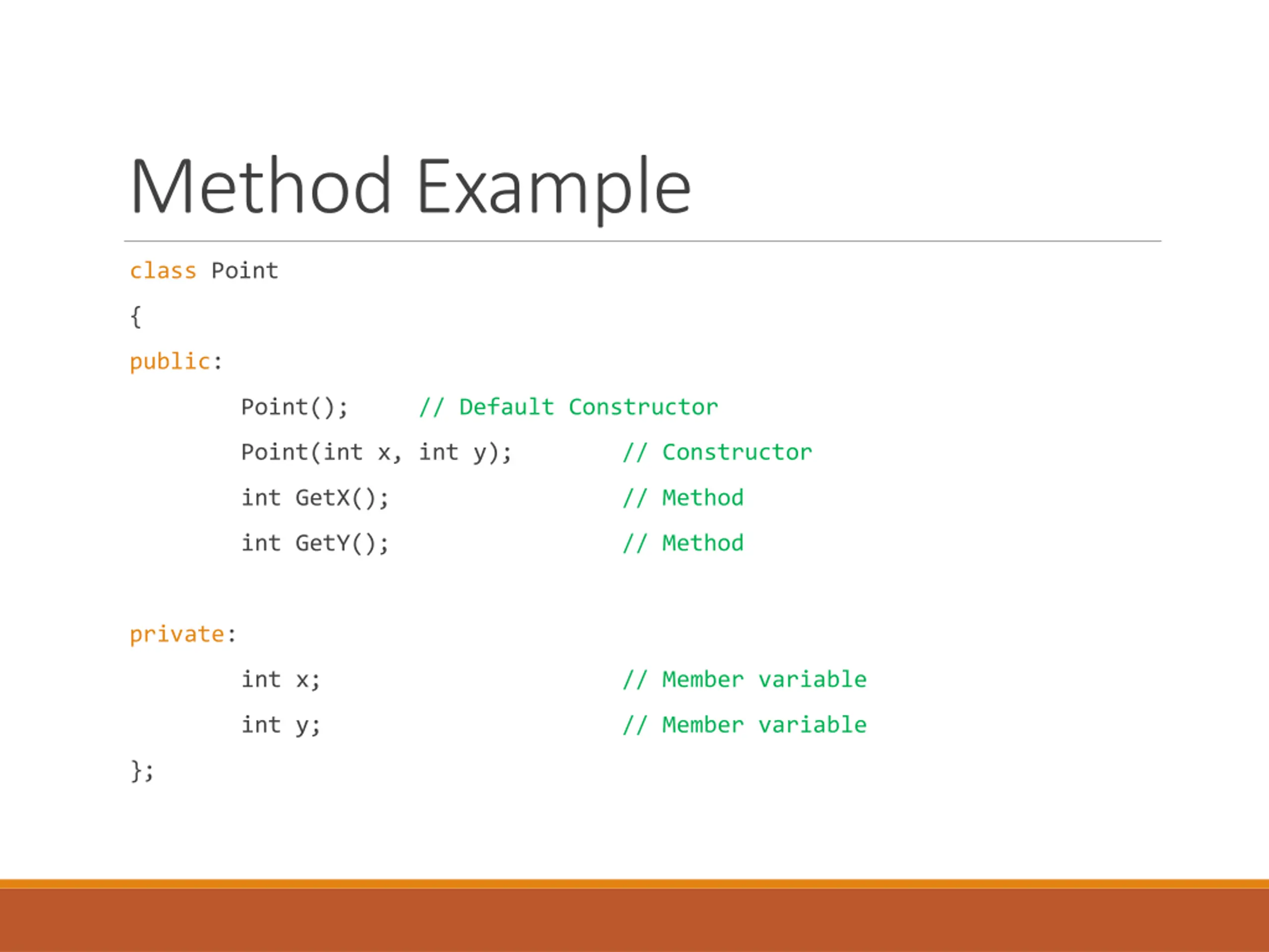 Method Example class Point { public: Point(); // Default Constructor Point(int x, int y); // Constructor int GetX(); // Method int GetY(); // Method private: int x; // Member variable int y; // Member variable };