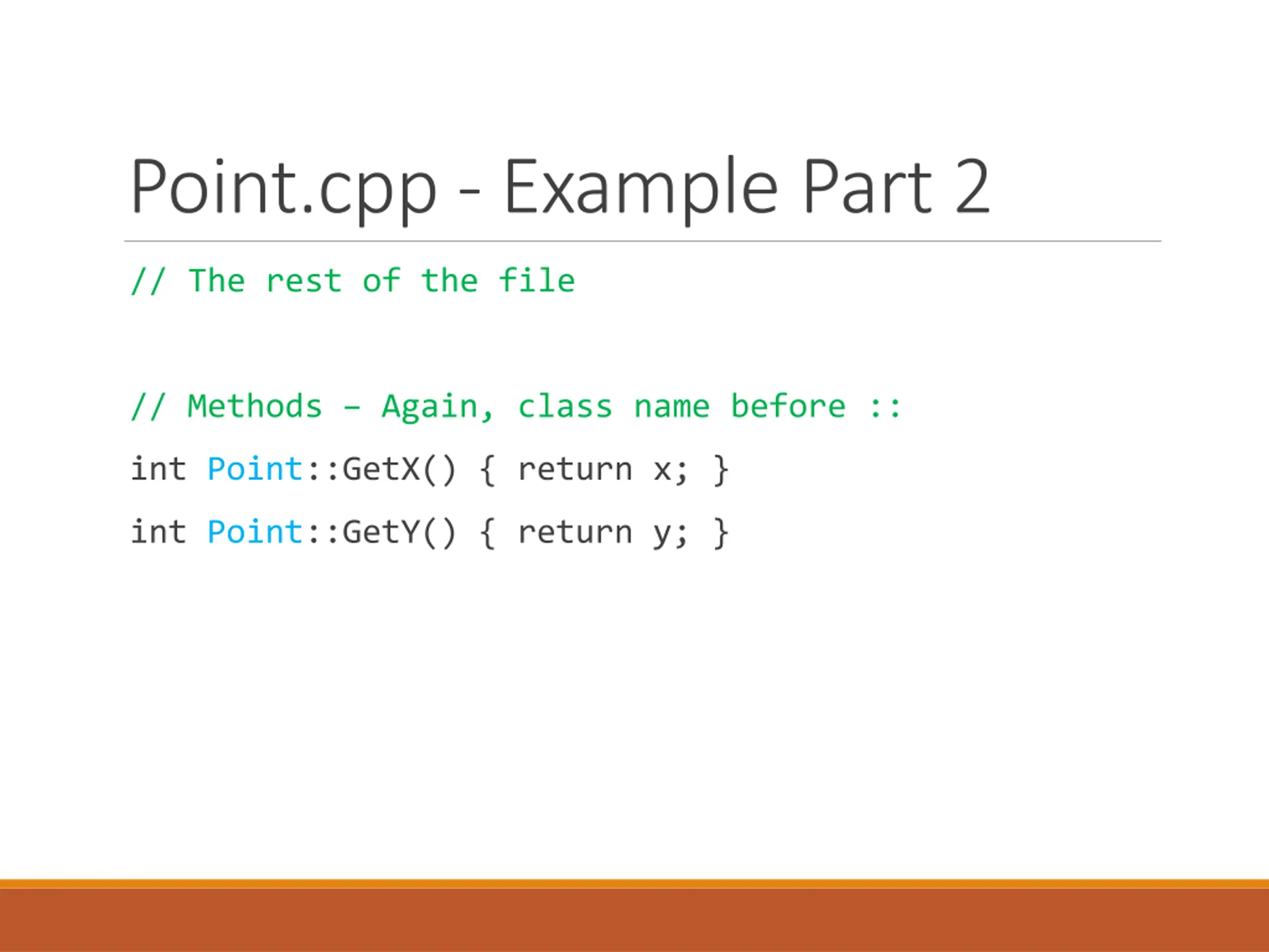 Point.cpp - Example Part 2 // The rest of the file // Methods Again, class name before :: int Point::GetX() { return x; } int Point::GetY() { return y; }