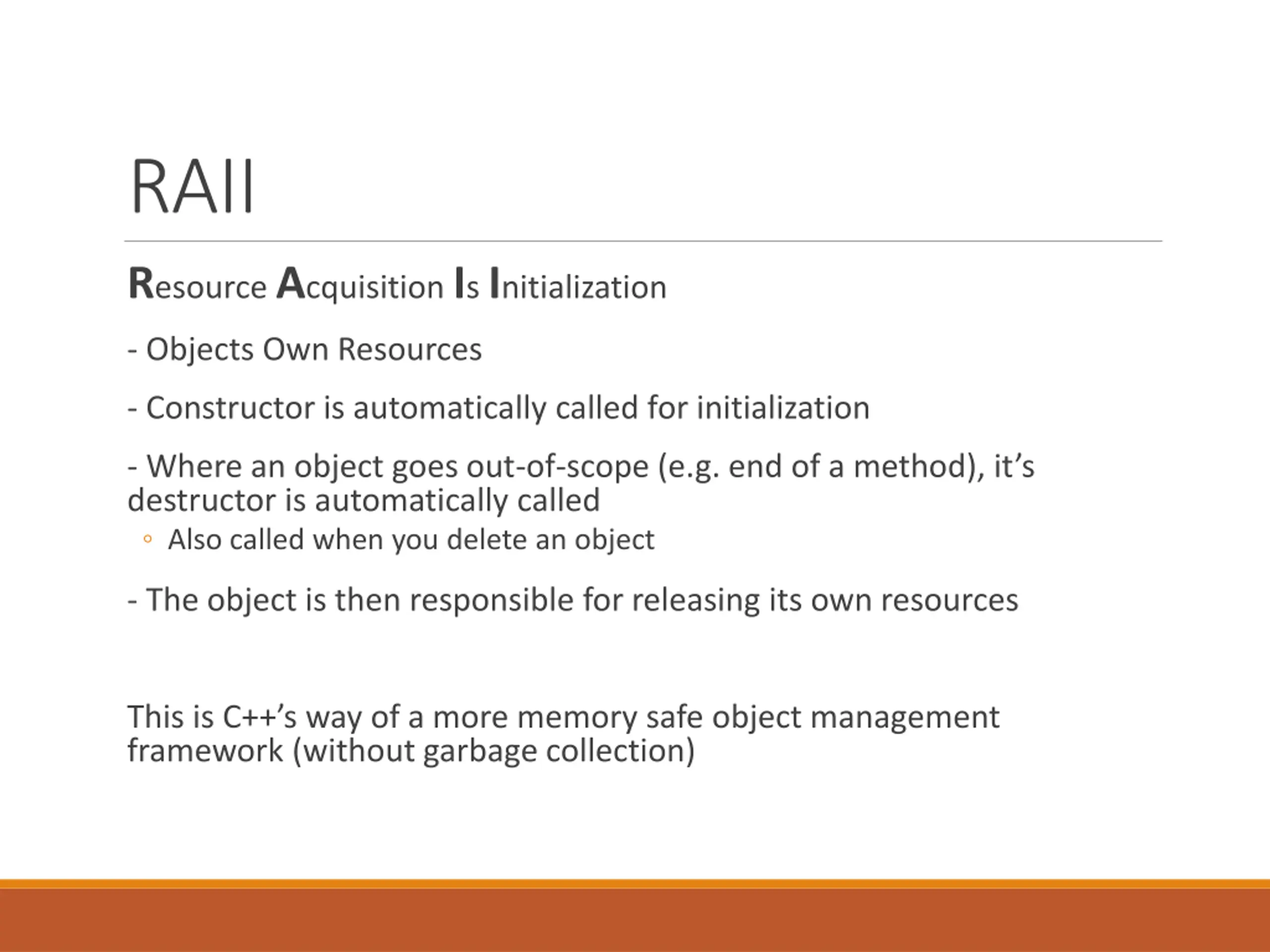 RAII Resource Acquisition Is Initialization - Objects Own Resources - Constructor is automatically called for initialization - Where an object goes out-of-scope (e.g. end of a method), it s destructor is automatically called Also called when you delete an object - The object is then responsible for releasing its own resources This is C++ s way of a more memory safe object management framework (without garbage collection)