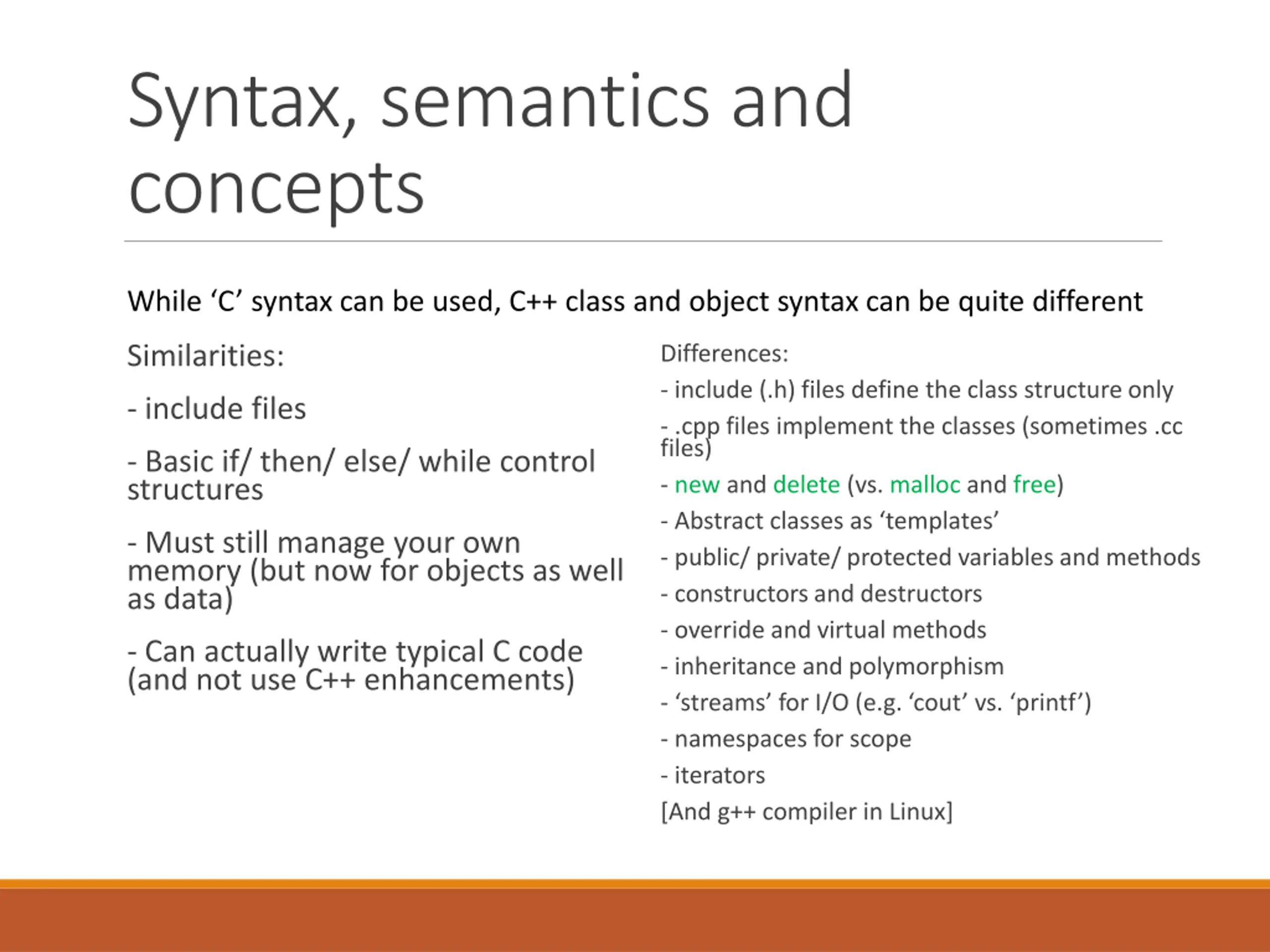 Syntax, semantics and concepts While C syntax can be used, C++ class and object syntax can be quite different Similarities: Differences: - include (.h) files define the class structure only - .cpp files implement the classes (sometimes .cc files) - new and delete (vs. malloc and free) - Abstract classes as templates - public/ private/ protected variables and methods - constructors and destructors - override and virtual methods - inheritance and polymorphism - streams for I/O (e.g. cout vs. printf ) - namespaces for scope - iterators [And g++ compiler in Linux] - include files - Basic if/ then/ else/ while control structures - Must still manage your own memory (but now for objects as well as data) - Can actually write typical C code (and not use C++ enhancements)