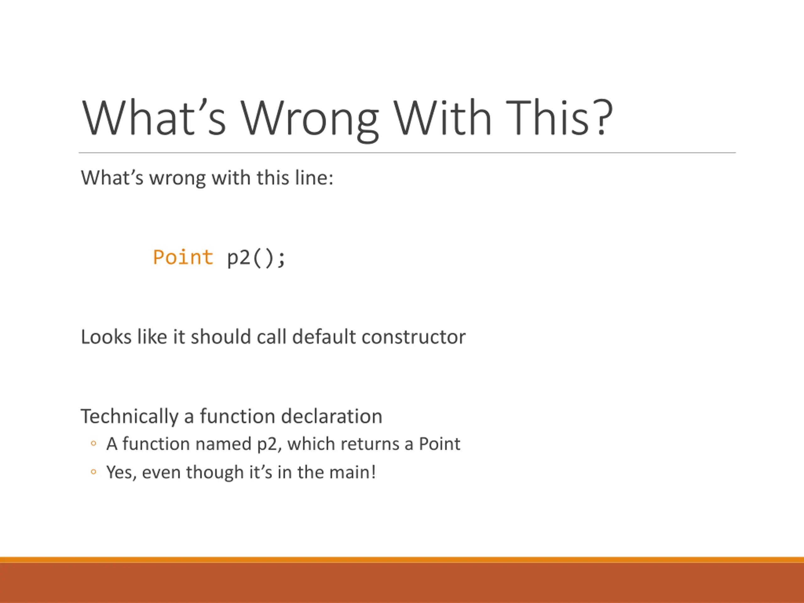 Whats Wrong With This? What s wrong with this line: Point p2(); Looks like it should call default constructor Technically a function declaration A function named p2, which returns a Point Yes, even though it s in the main!