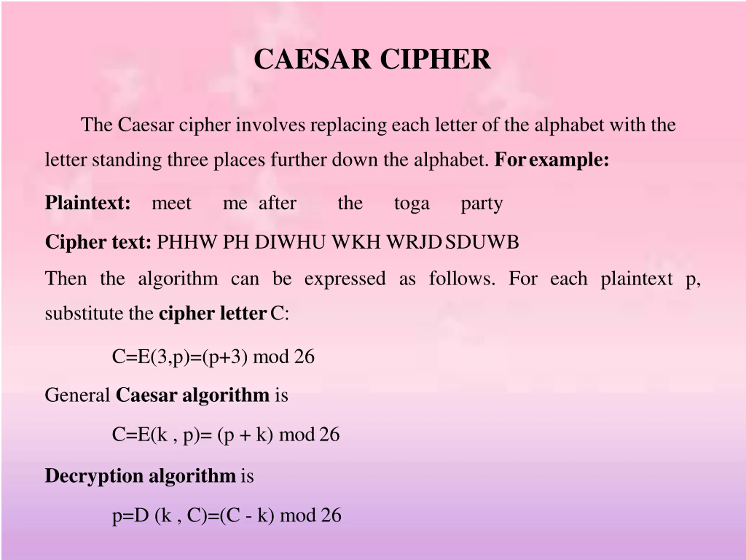 CAESAR CIPHER The Caesar cipher involves replacing each letter of the alphabet with the letter standing three places further down the alphabet. Forexample: Plaintext: meet me after the toga party Cipher text: PHHW PH DIWHU WKH WRJDSDUWB Then the algorithm can be expressed as follows. For each plaintext p, substitute the cipher letterC: C=E(3,p)=(p+3) mod 26 General Caesar algorithm is C=E(k , p)= (p + k) mod26 Decryption algorithmis p=D (k , C)=(C - k) mod 26