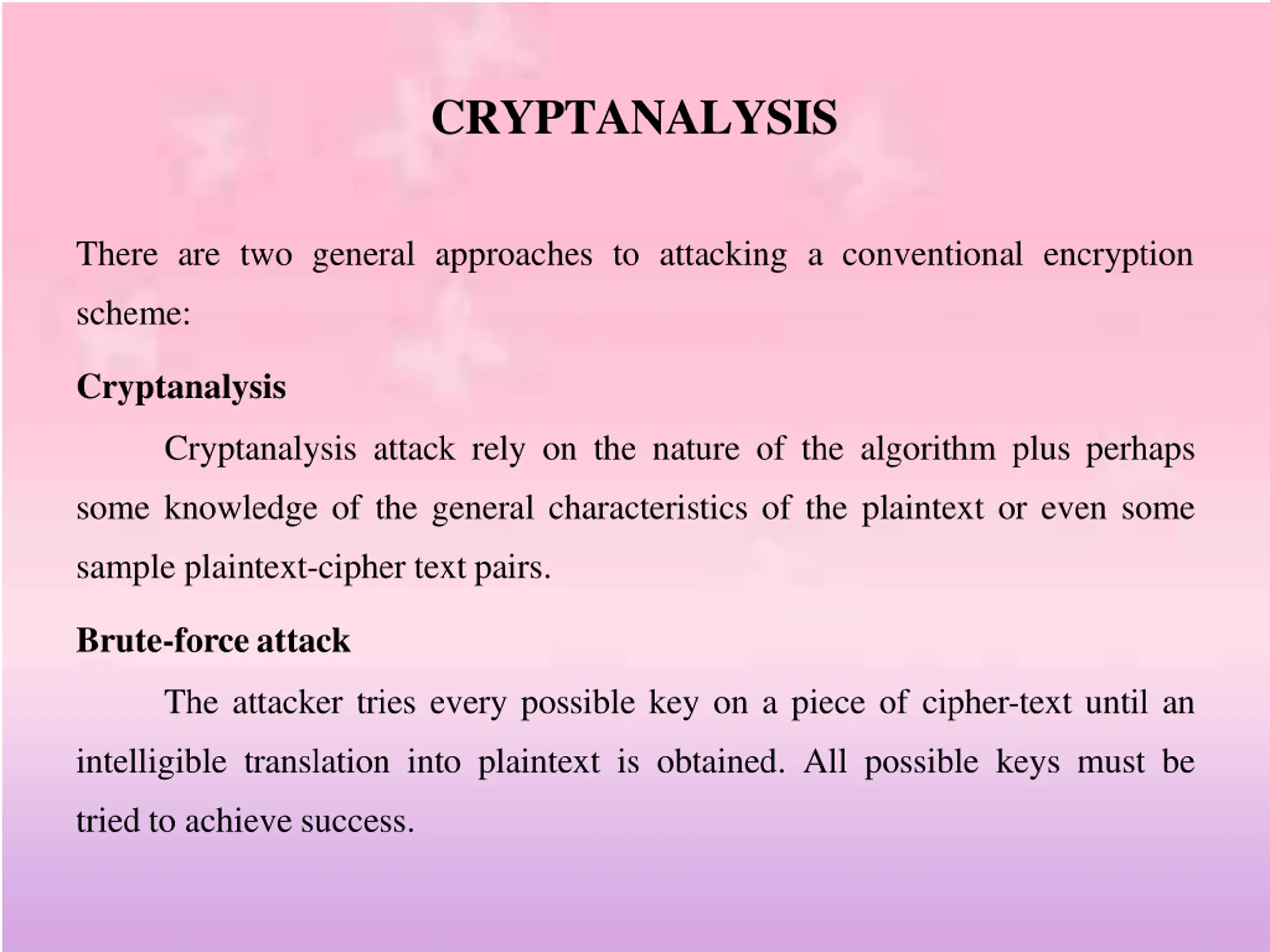 CRYPTANALYSIS There are two general approaches to attacking a conventional encryption scheme: Cryptanalysis Cryptanalysis attack rely on the nature of the algorithm plus perhaps some knowledge of the general characteristics of the plaintext or even some sample plaintext-cipher text pairs. Brute-force attack The attacker tries every possible key on a piece of cipher-text until an intelligible translation into plaintext is obtained. All possible keys must be tried to achieve success.