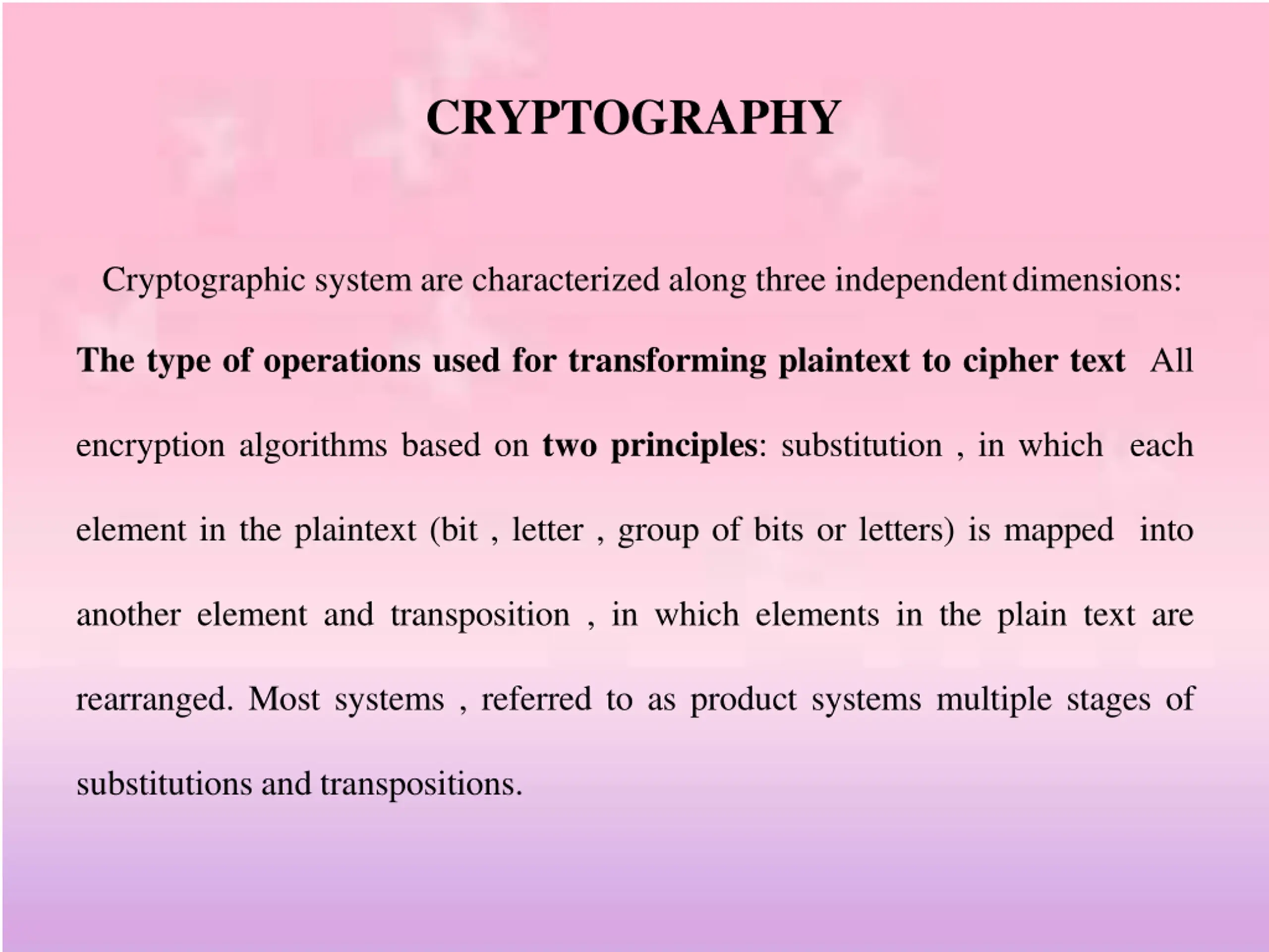 CRYPTOGRAPHY Cryptographic system are characterized along three independentdimensions: The type of operations used for transforming plaintext to cipher text All encryption algorithms based on two principles: substitution , in which each element in the plaintext (bit , letter , group of bits or letters) is mapped into another element and transposition , in which elements in the plain text are rearranged. Most systems , referred to as product systems multiple stages of substitutions and transpositions.