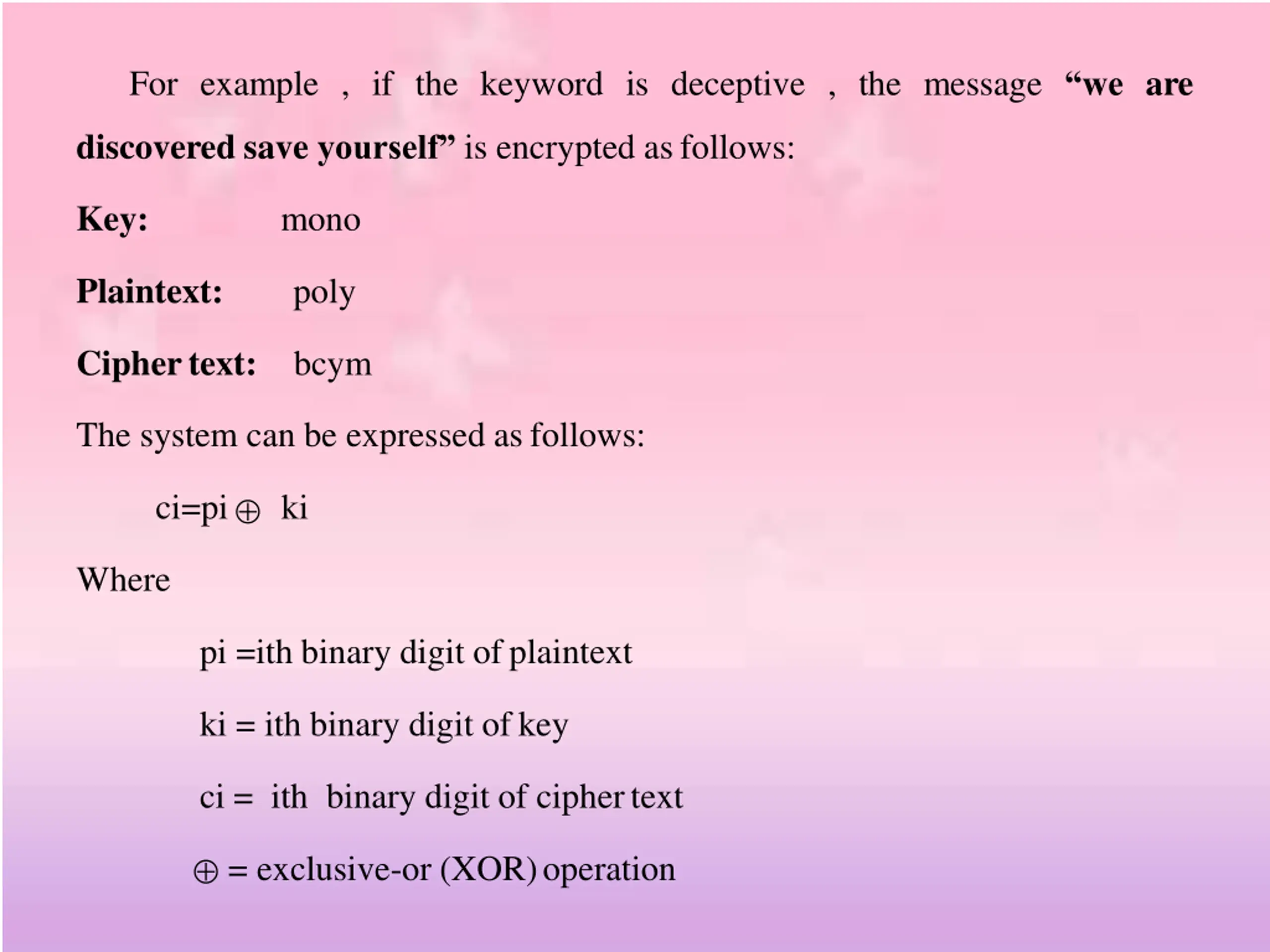 For example , if the keyword is deceptive , the message we are discovered save yourself is encrypted asfollows: Key: mono Plaintext: poly Ciphertext: bcym The system can be expressed asfollows: ci=pi ki Where pi =ith binary digit ofplaintext ki = ith binary digit ofkey ci = ith binary digit of ciphertext = exclusive-or (XOR)operation