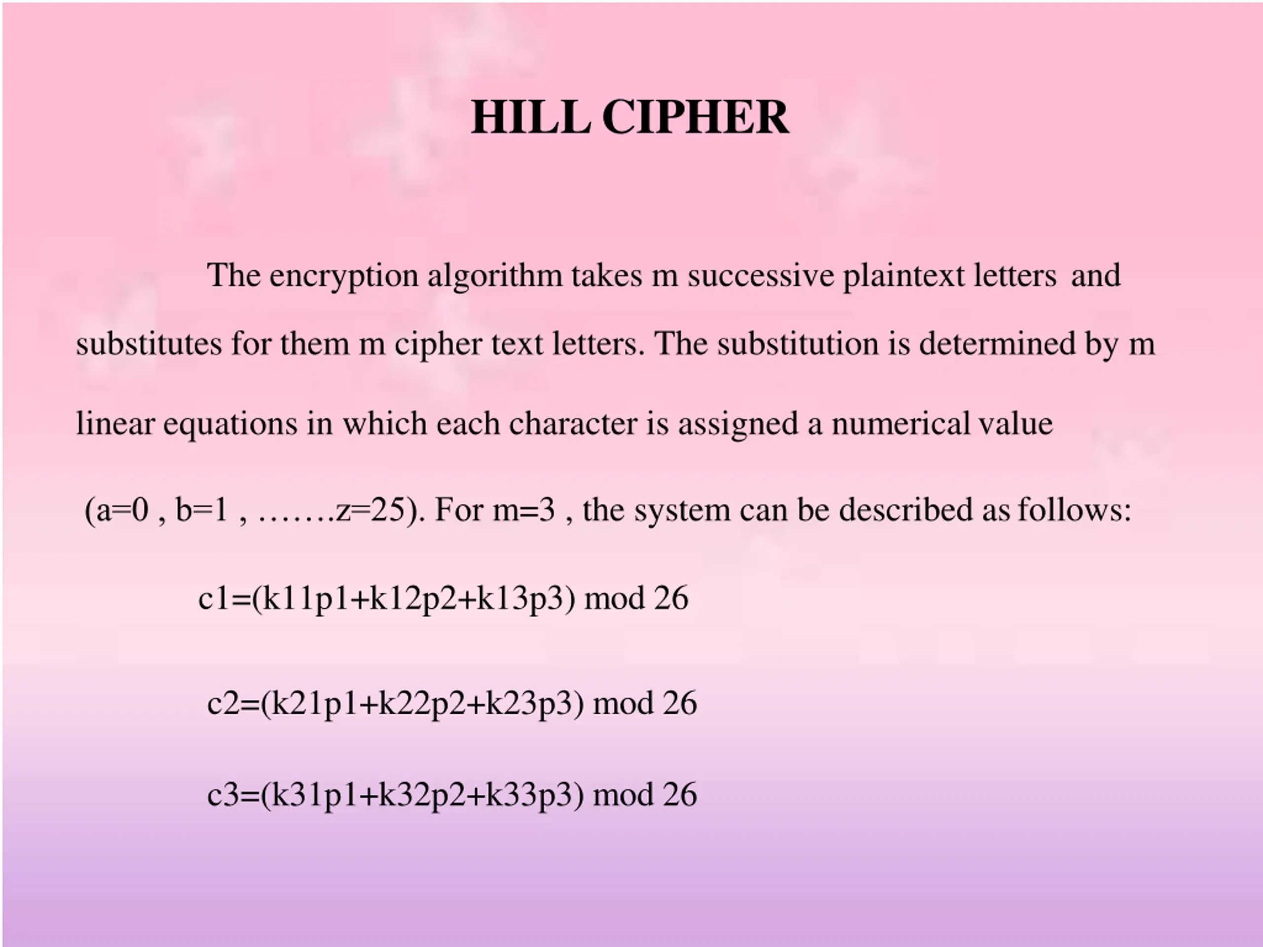 HILLCIPHER The encryption algorithm takes m successive plaintext letters and substitutes for them m cipher text letters. The substitution is determined by m linear equations in which each character is assigned a numericalvalue (a=0 , b=1 , .z=25). For m=3 , the system can be described asfollows: c1=(k11p1+k12p2+k13p3) mod 26 c2=(k21p1+k22p2+k23p3) mod 26 c3=(k31p1+k32p2+k33p3) mod 26