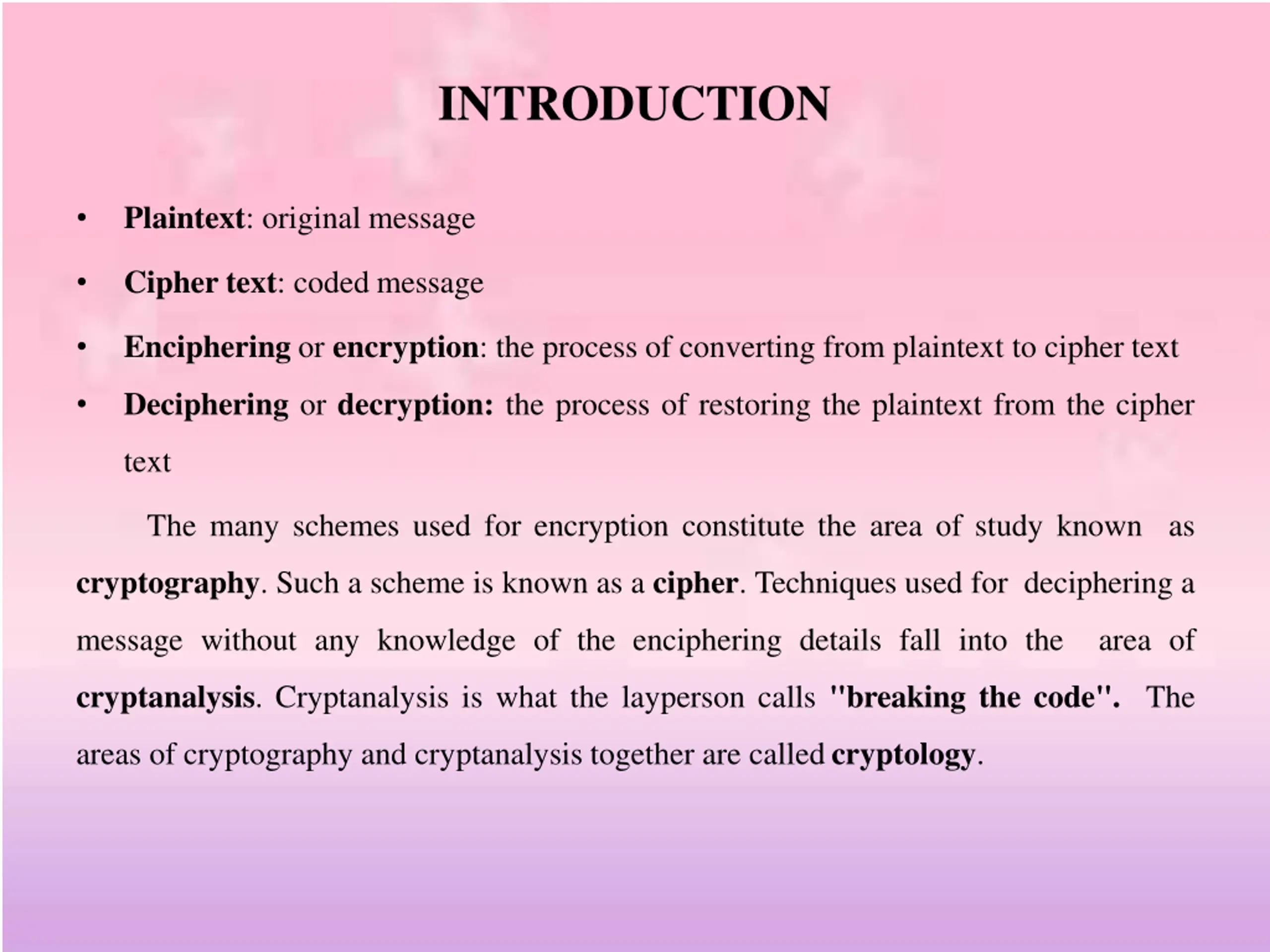 INTRODUCTION Plaintext: original message Cipher text: coded message Enciphering or encryption: the process of converting from plaintext to cipher text Deciphering or decryption: the process of restoring the plaintext from the cipher text The many schemes used for encryption constitute the area of study known as cryptography. Such a scheme is known as a cipher. Techniques used for deciphering a message without any knowledge of the enciphering details fall into the area of cryptanalysis. Cryptanalysis is what the layperson calls "breaking the code". The areas of cryptography and cryptanalysis together are calledcryptology.