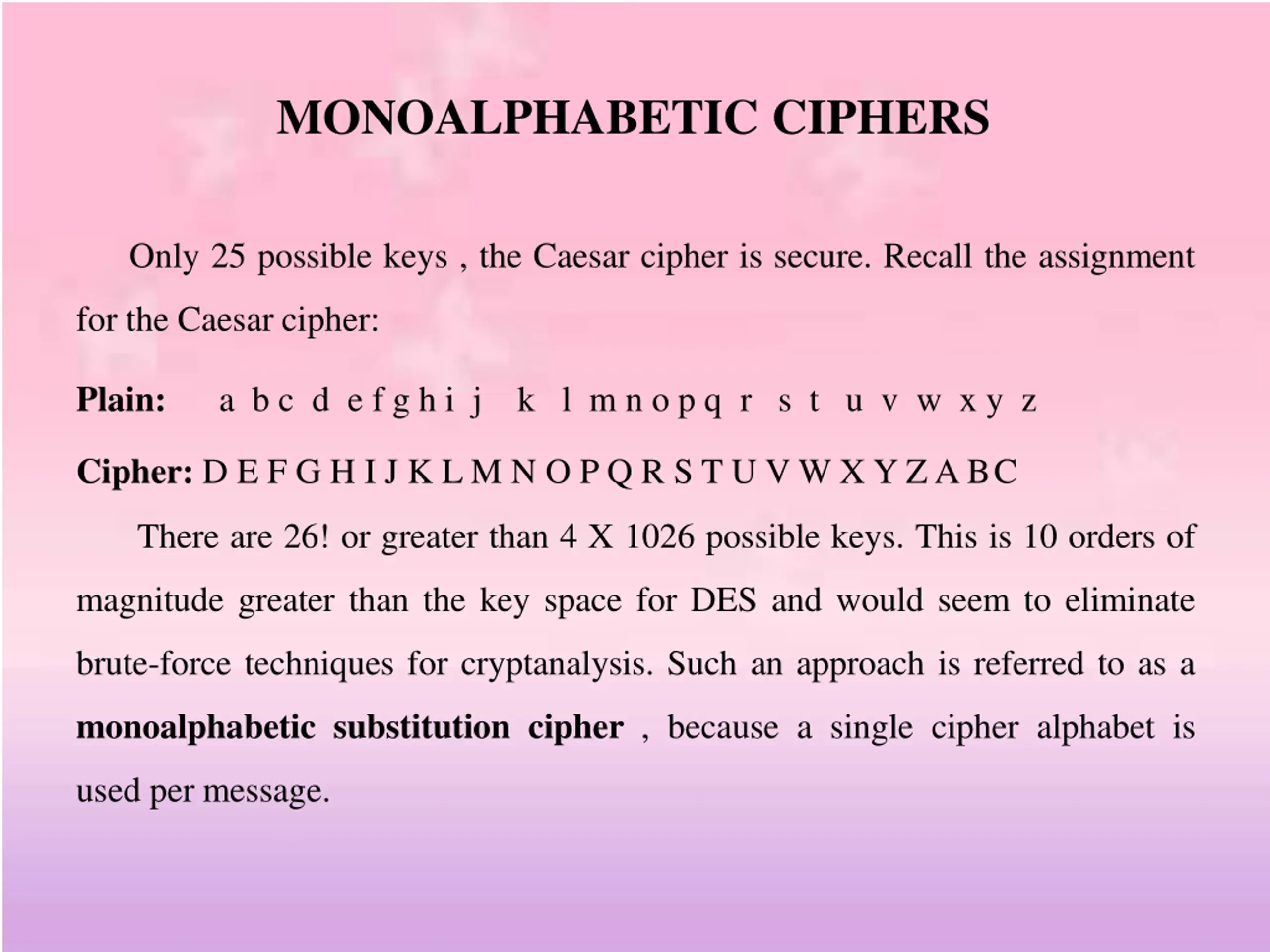 MONOALPHABETIC CIPHERS Only 25 possible keys , the Caesar cipher is secure. Recall the assignment for the Caesar cipher: Plain: a b c d e f g h i j k l m n o p q r s t u v w x y z Cipher: D E F G H I J K L M N O P Q R S T U V W X Y Z A BC There are 26! or greater than 4 X 1026 possible keys. This is 10 orders of magnitude greater than the key space for DES and would seem to eliminate brute-force techniques for cryptanalysis. Such an approach is referred to as a monoalphabetic substitution cipher , because a single cipher alphabet is used per message.