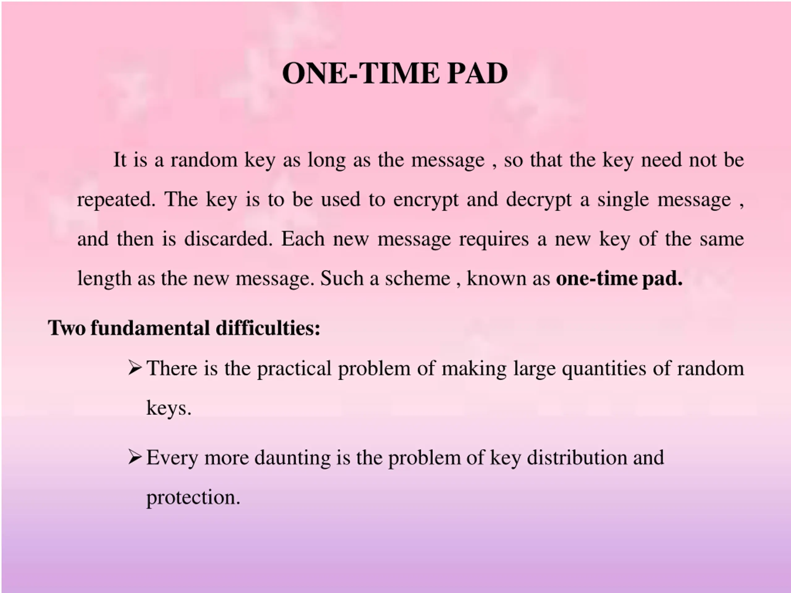 ONE-TIME PAD It is a random key as long as the message , so that the key need not be repeated. The key is to be used to encrypt and decrypt a single message , and then is discarded. Each new message requires a new key of the same length as the new message. Such a scheme , known as one-timepad. Two fundamental difficulties: There is the practical problem of making large quantities of random keys. Every more daunting is the problem of key distribution and protection.