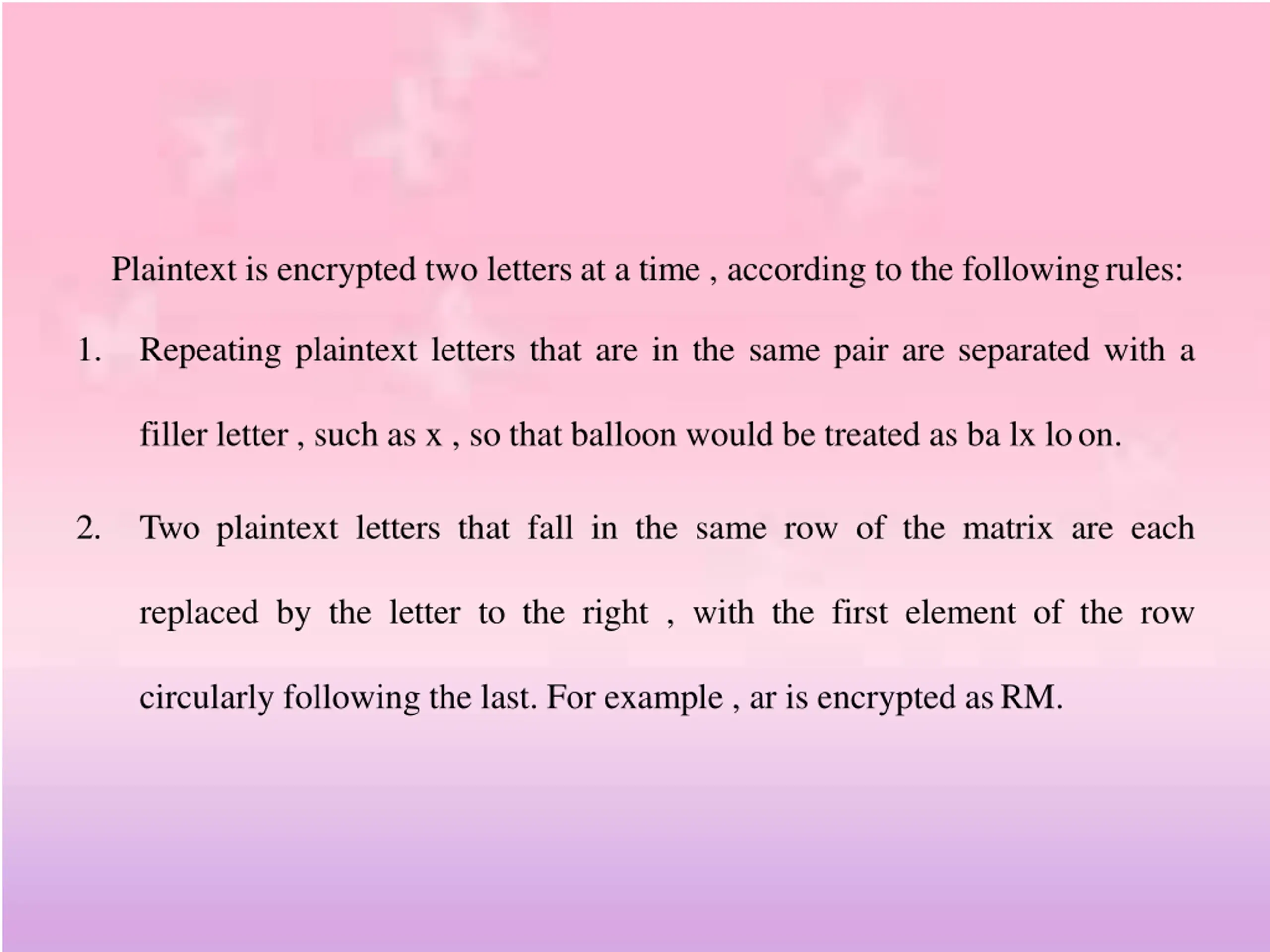 Plaintext is encrypted two letters at a time , according to the followingrules: 1. Repeating plaintext letters that are in the same pair are separated with a filler letter , such as x , so that balloon would be treated as ba lx loon. 2. Two plaintext letters that fall in the same row of the matrix are each replaced by the letter to the right , with the first element of the row circularly following the last. For example , ar is encrypted asRM.