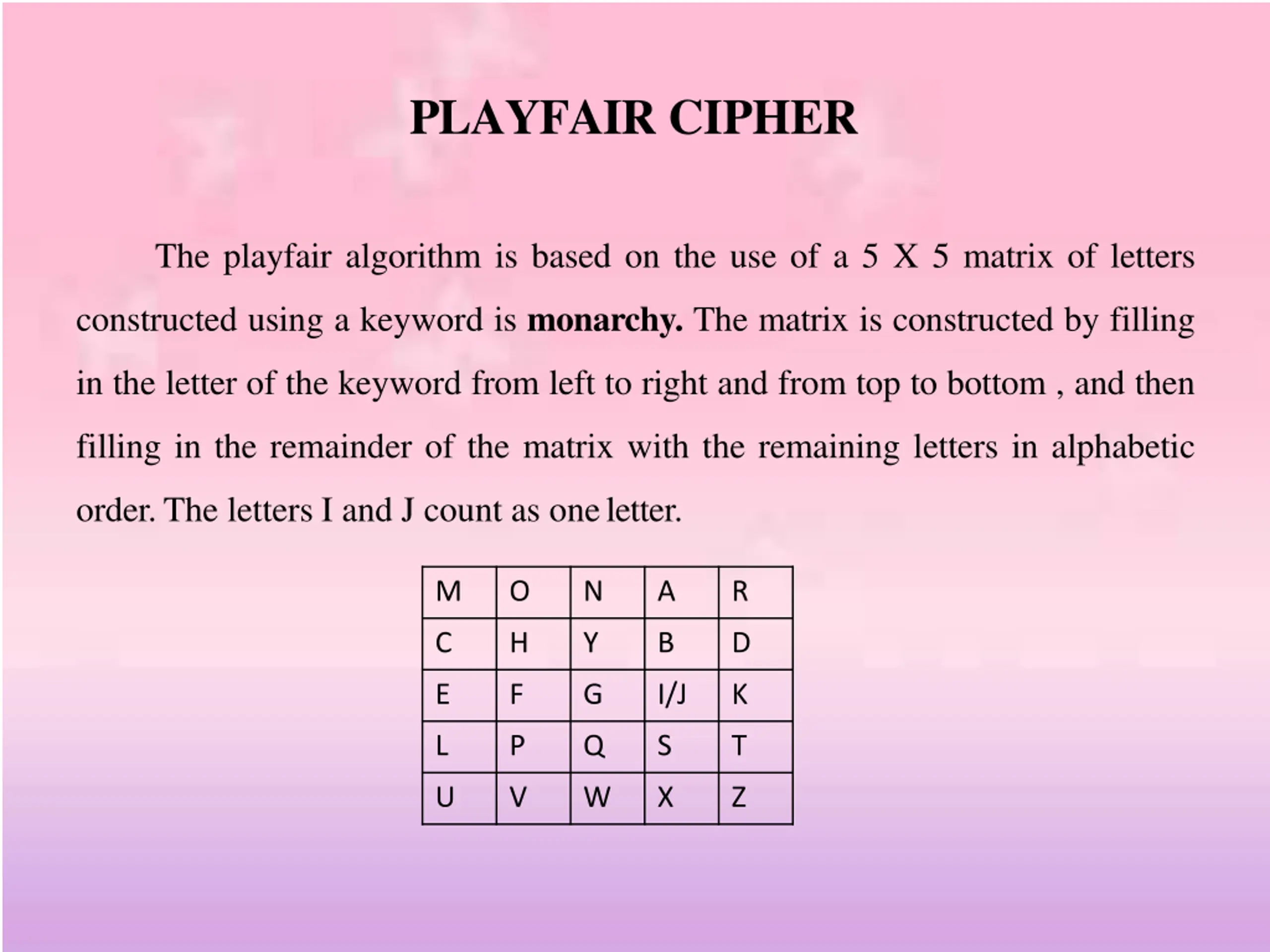 PLAYFAIR CIPHER The playfair algorithm is based on the use of a 5 X 5 matrix of letters constructed using a keyword is monarchy. The matrix is constructed by filling in the letter of the keyword from left to right and from top to bottom , and then filling in the remainder of the matrix with the remaining letters in alphabetic order.The letters I and J count as oneletter. M O N A R C H Y B D E F G I/J K L P Q S T U V W X Z