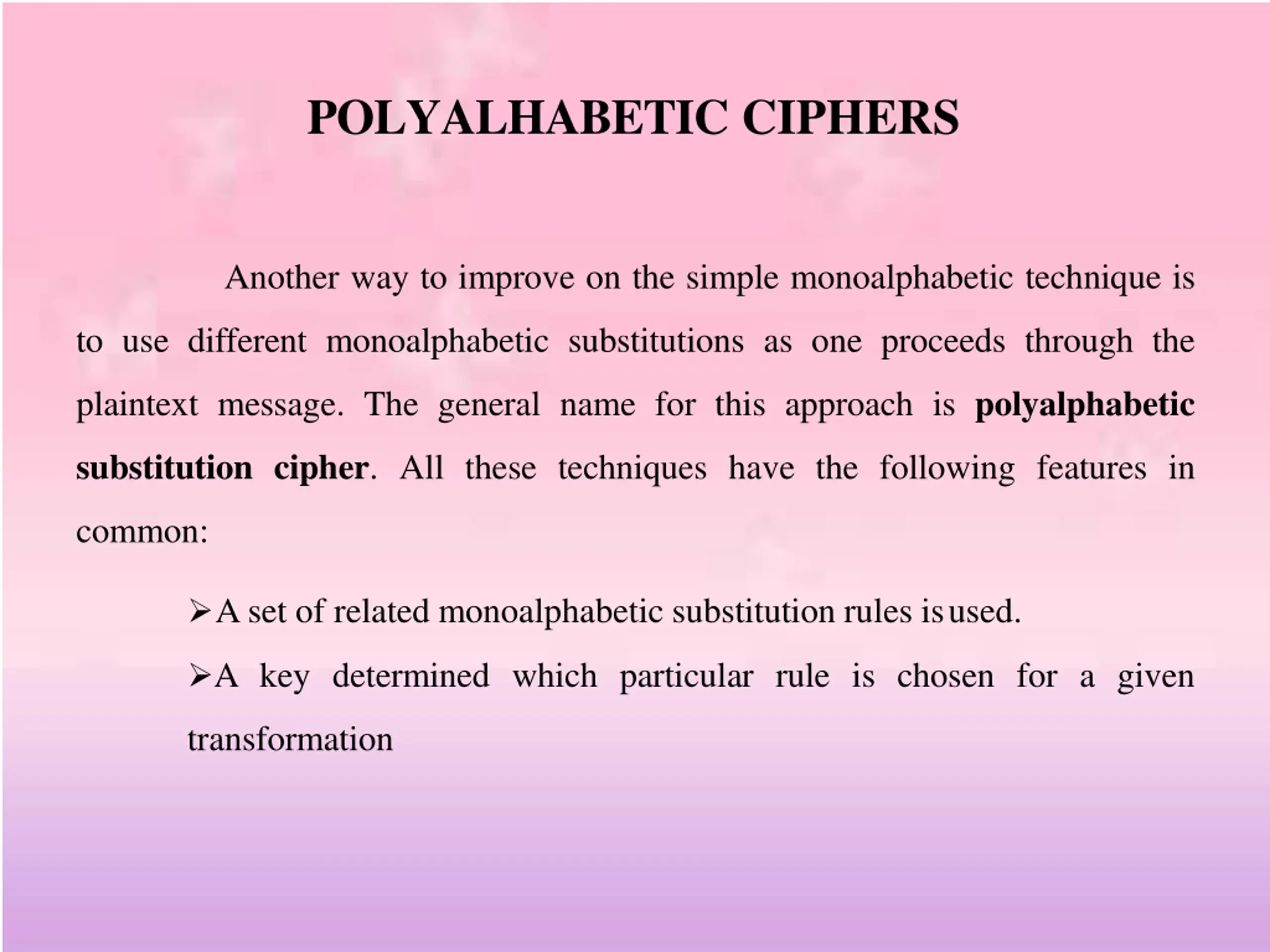 POLYALHABETIC CIPHERS Another way to improve on the simple monoalphabetic technique is to use different monoalphabetic substitutions as one proceeds through the plaintext message. The general name for this approach is polyalphabetic substitution cipher. All these techniques have the following features in common: Aset of related monoalphabetic substitution rules isused. A key determined which particular rule is chosen for a given transformation