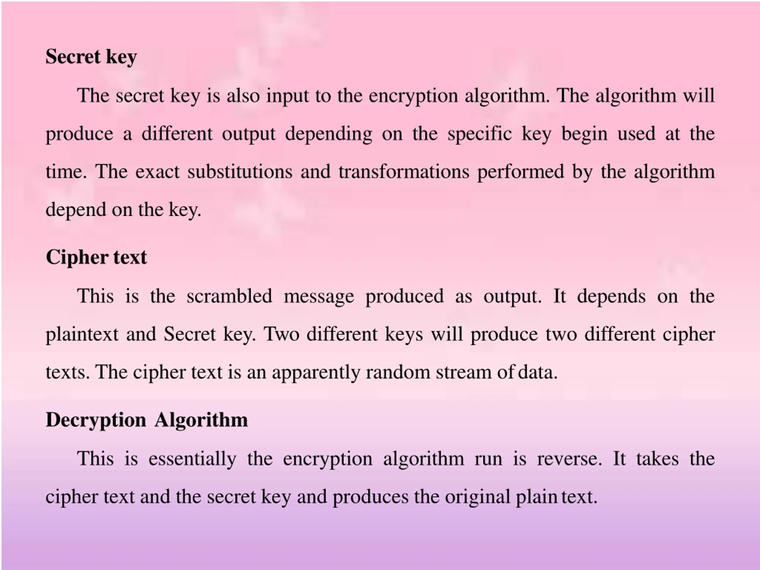 Secret key The secret key is also input to the encryption algorithm. The algorithm will produce a different output depending on the specific key begin used at the time. The exact substitutions and transformations performed by the algorithm depend on the key. Ciphertext This is the scrambled message produced as output. It depends on the plaintext and Secret key. Two different keys will produce two different cipher texts. The cipher text is an apparently random stream ofdata. Decryption Algorithm This is essentially the encryption algorithm run is reverse. It takes the cipher text and the secret key and produces the original plaintext.