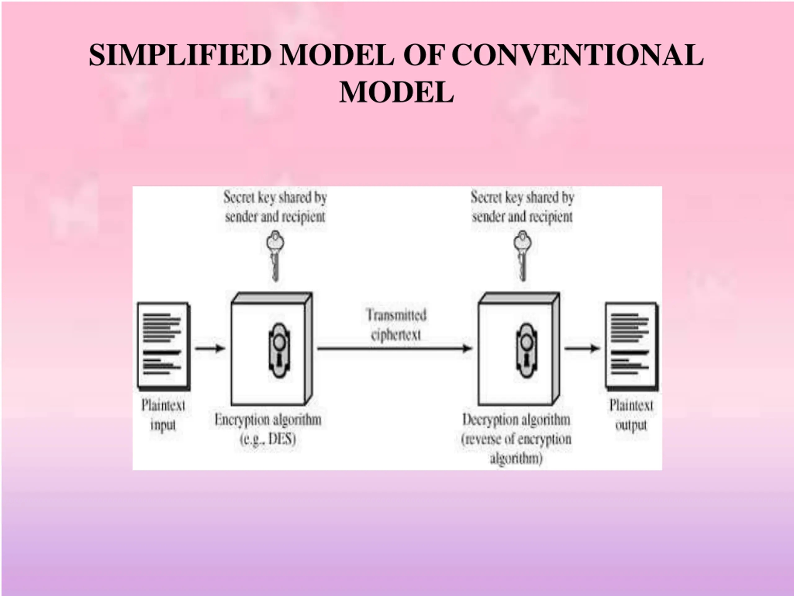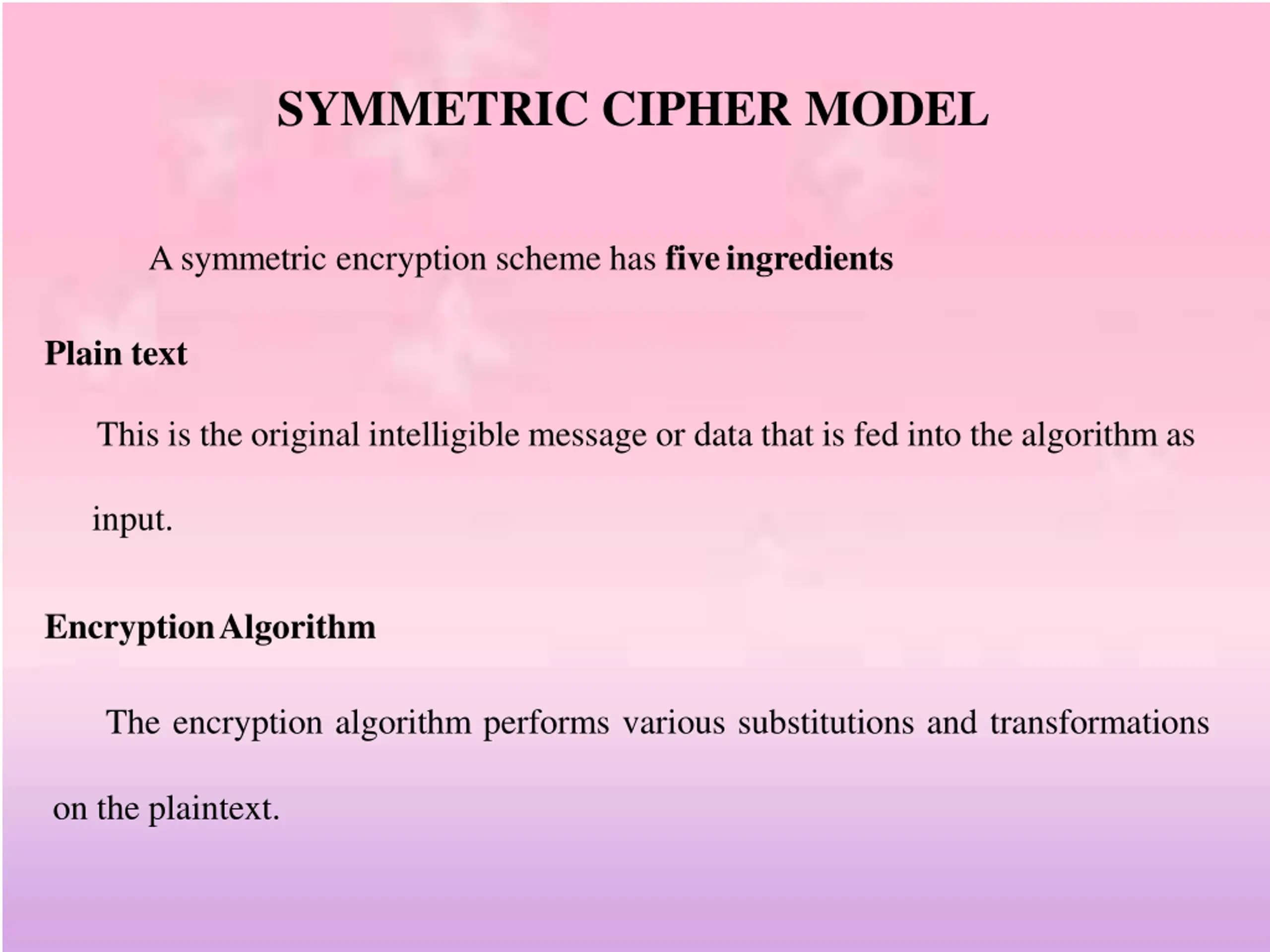 SYMMETRIC CIPHER MODEL A symmetric encryption scheme has fiveingredients Plain text This is the original intelligible message or data that is fed into the algorithm as input. EncryptionAlgorithm The encryption algorithm performs various substitutions and transformations on the plaintext.