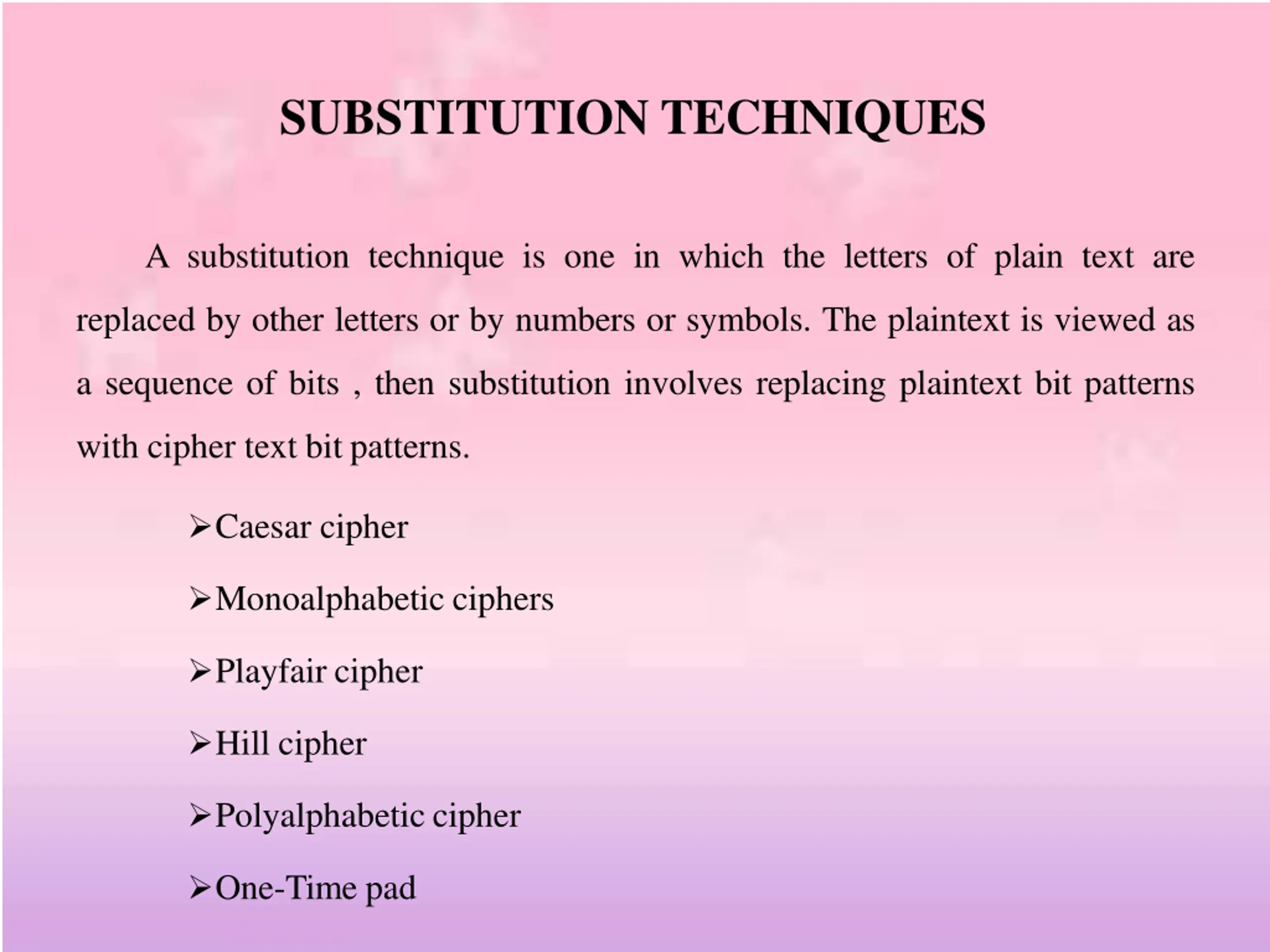 SUBSTITUTION TECHNIQUES A substitution technique is one in which the letters of plain text are replaced by other letters or by numbers or symbols. The plaintext is viewed as a sequence of bits , then substitution involves replacing plaintext bit patterns with cipher text bit patterns. Caesar cipher Monoalphabetic ciphers Playfair cipher Hill cipher Polyalphabetic cipher One-Time pad