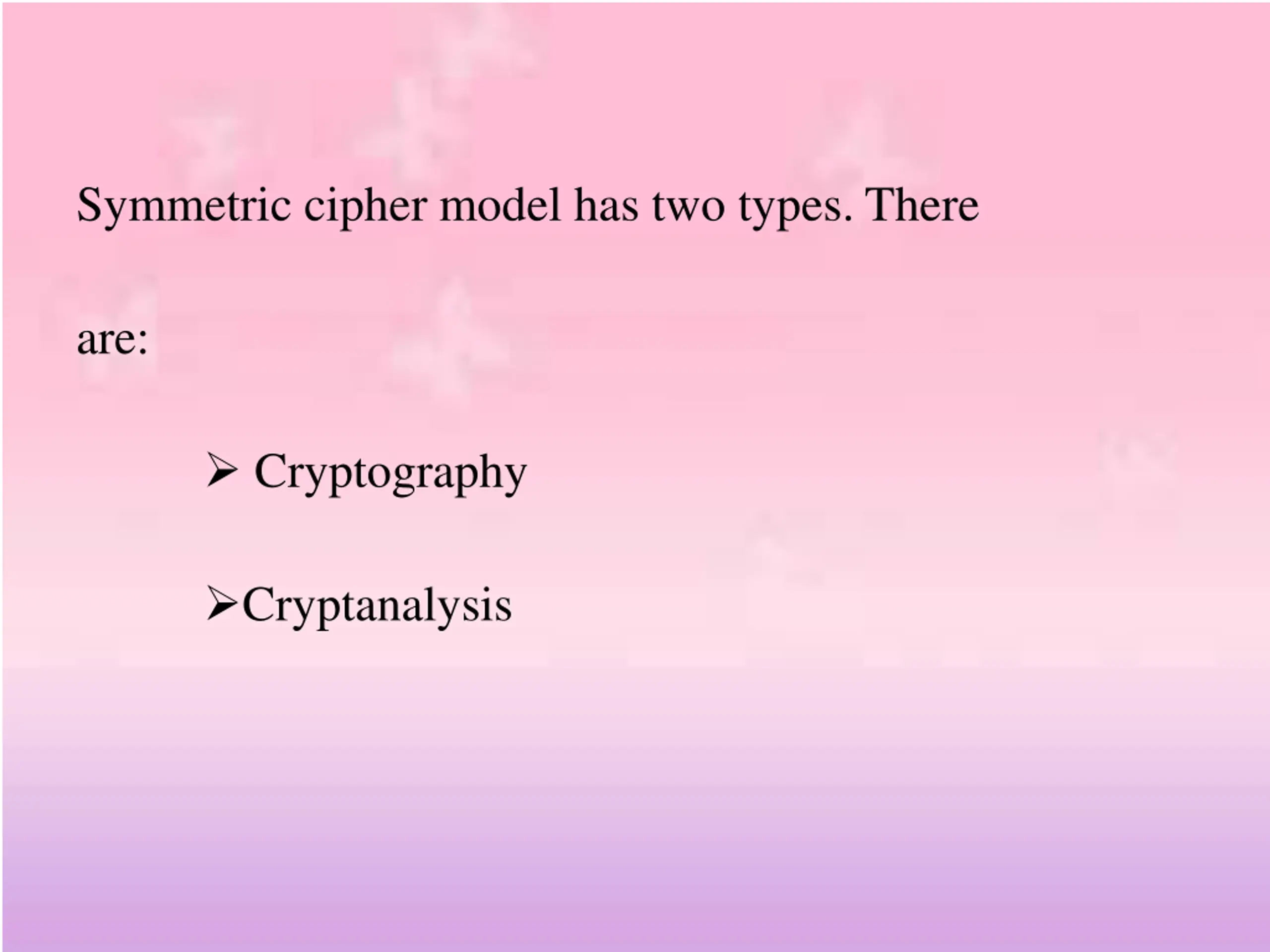 Symmetric cipher model has two types. There are: Cryptography Cryptanalysis
