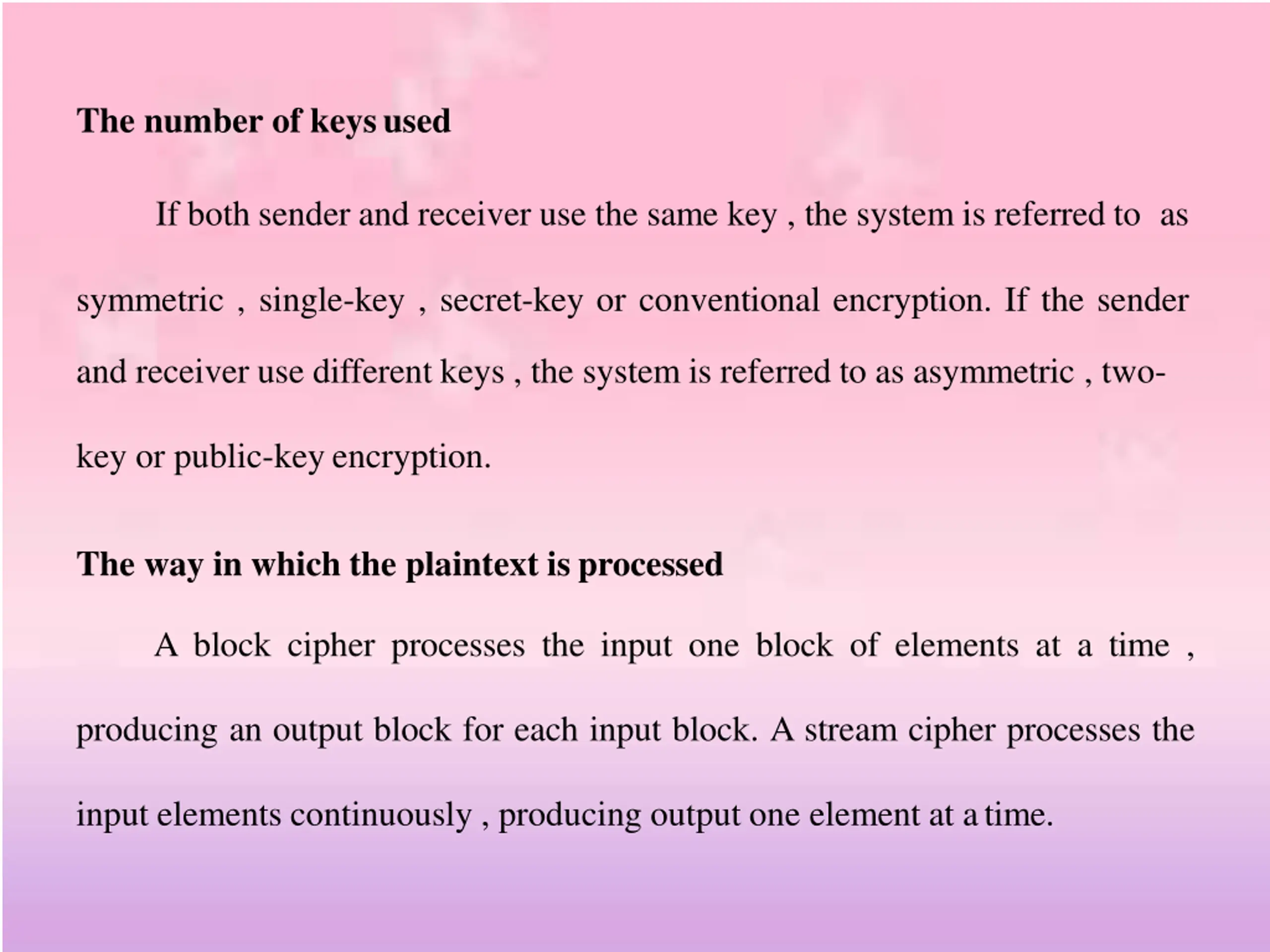 The number of keysused If both sender and receiver use the same key , the system is referred to as symmetric , single-key , secret-key or conventional encryption. If the sender and receiver use different keys , the system is referred to as asymmetric , two- key or public-keyencryption. The way in which the plaintext is processed A block cipher processes the input one block of elements at a time , producing an output block for each input block. A stream cipher processes the input elements continuously , producing output one element at atime.
