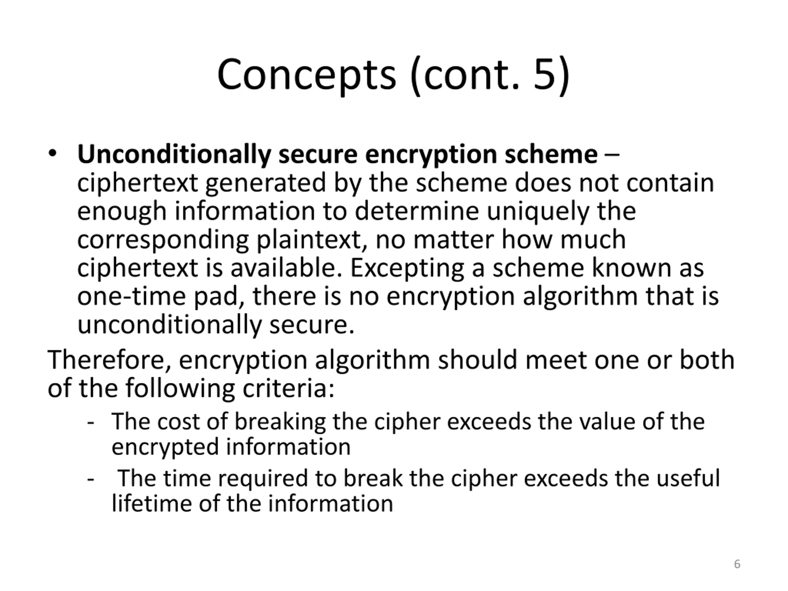 Concepts (cont. 5) Unconditionally secure encryption scheme ciphertext generated by the scheme does not contain enough information to determine uniquely the corresponding plaintext, no matter how much ciphertext is available. Excepting a scheme known as one-time pad, there is no encryption algorithm that is unconditionally secure. Therefore, encryption algorithm should meet one or both of the following criteria: - The cost of breaking the cipher exceeds the value of the encrypted information - The time required to break the cipher exceeds the useful lifetime of the information 6