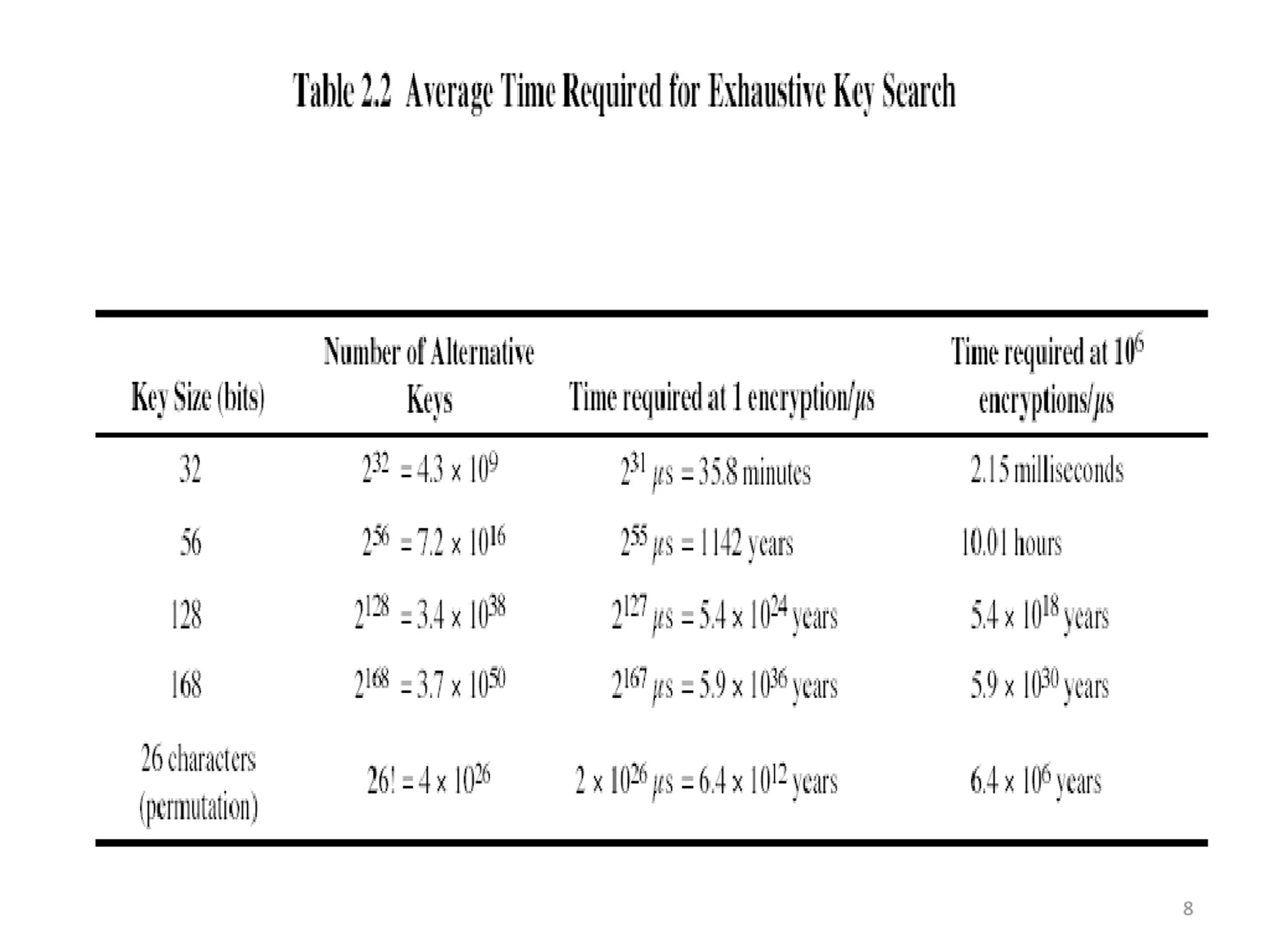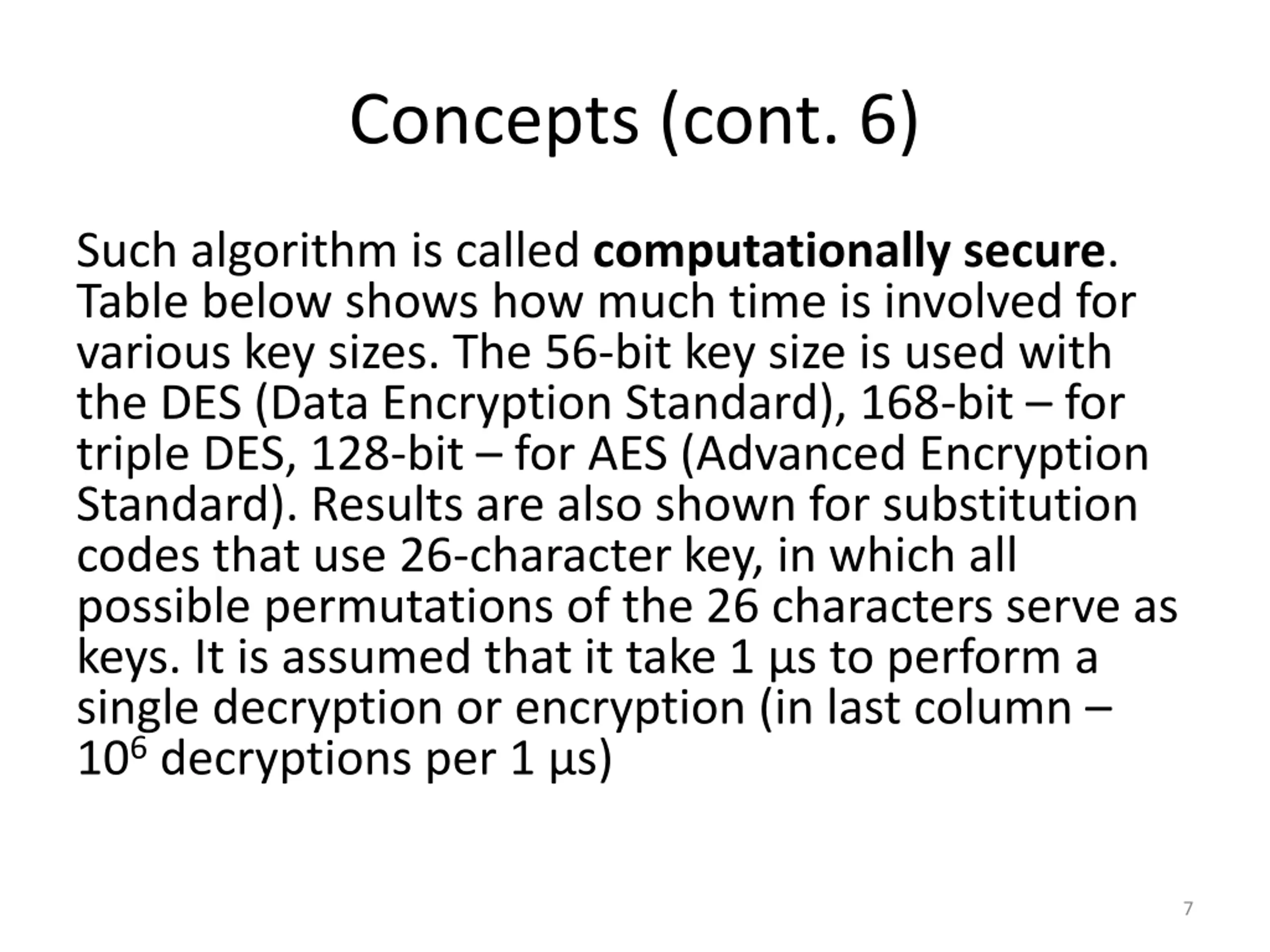 Concepts (cont. 6) Such algorithm is called computationally secure. Table below shows how much time is involved for various key sizes. The 56-bit key size is used with the DES (Data Encryption Standard), 168-bit for triple DES, 128-bit for AES (Advanced Encryption Standard). Results are also shown for substitution codes that use 26-character key, in which all possible permutations of the 26 characters serve as keys. It is assumed that it take 1 s to perform a single decryption or encryption (in last column 106decryptions per 1 s) 7