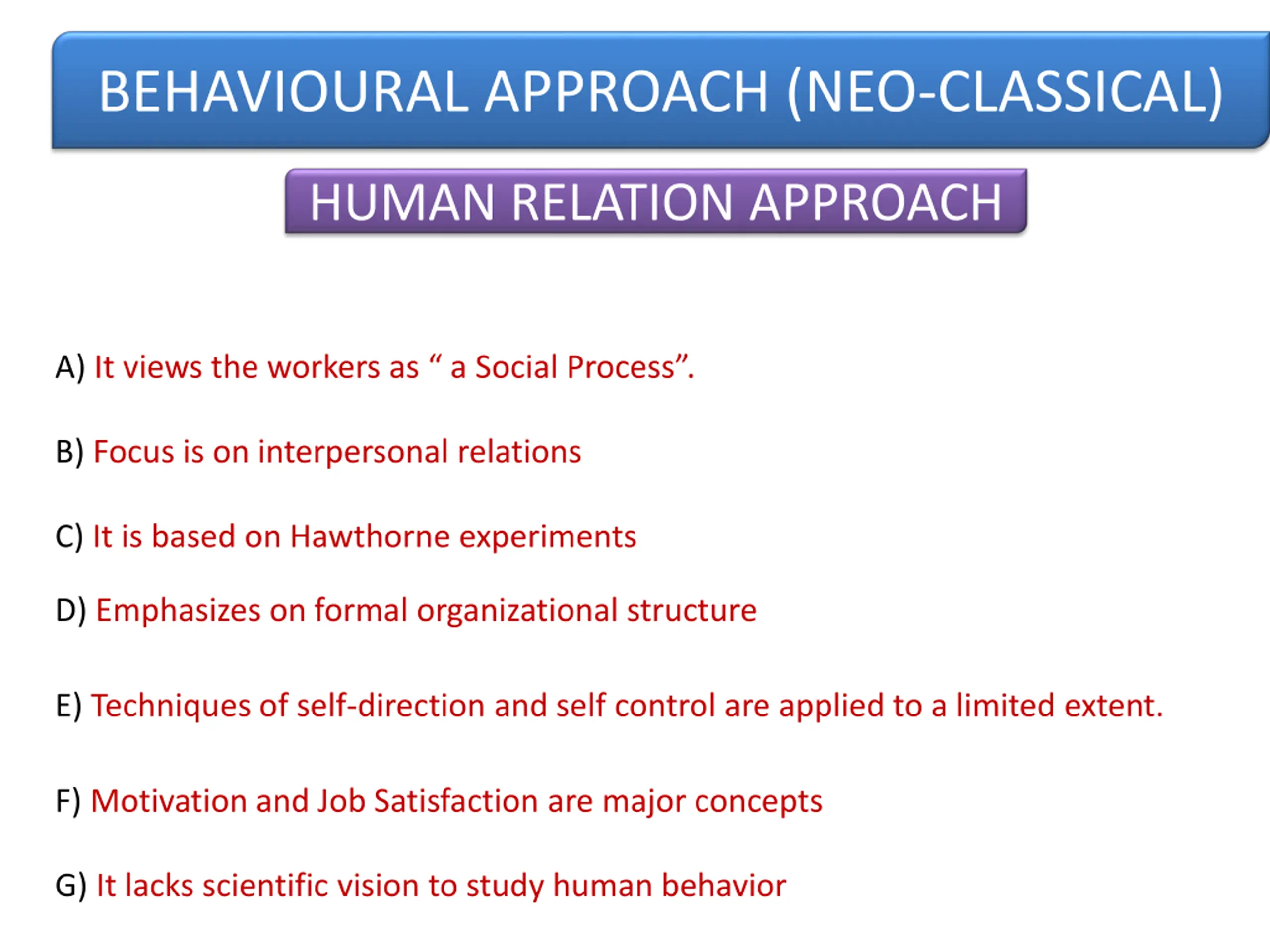 BEHAVIOURAL APPROACH (NEO-CLASSICAL) HUMAN RELATION APPROACH A) It views the workers as a Social Process . B) Focus is on interpersonal relations C) It is based on Hawthorne experiments D) Emphasizes on formal organizational structure E) Techniques of self-direction and self control are applied to a limited extent. F) Motivation and Job Satisfaction are major concepts G) It lacks scientific vision to study human behavior