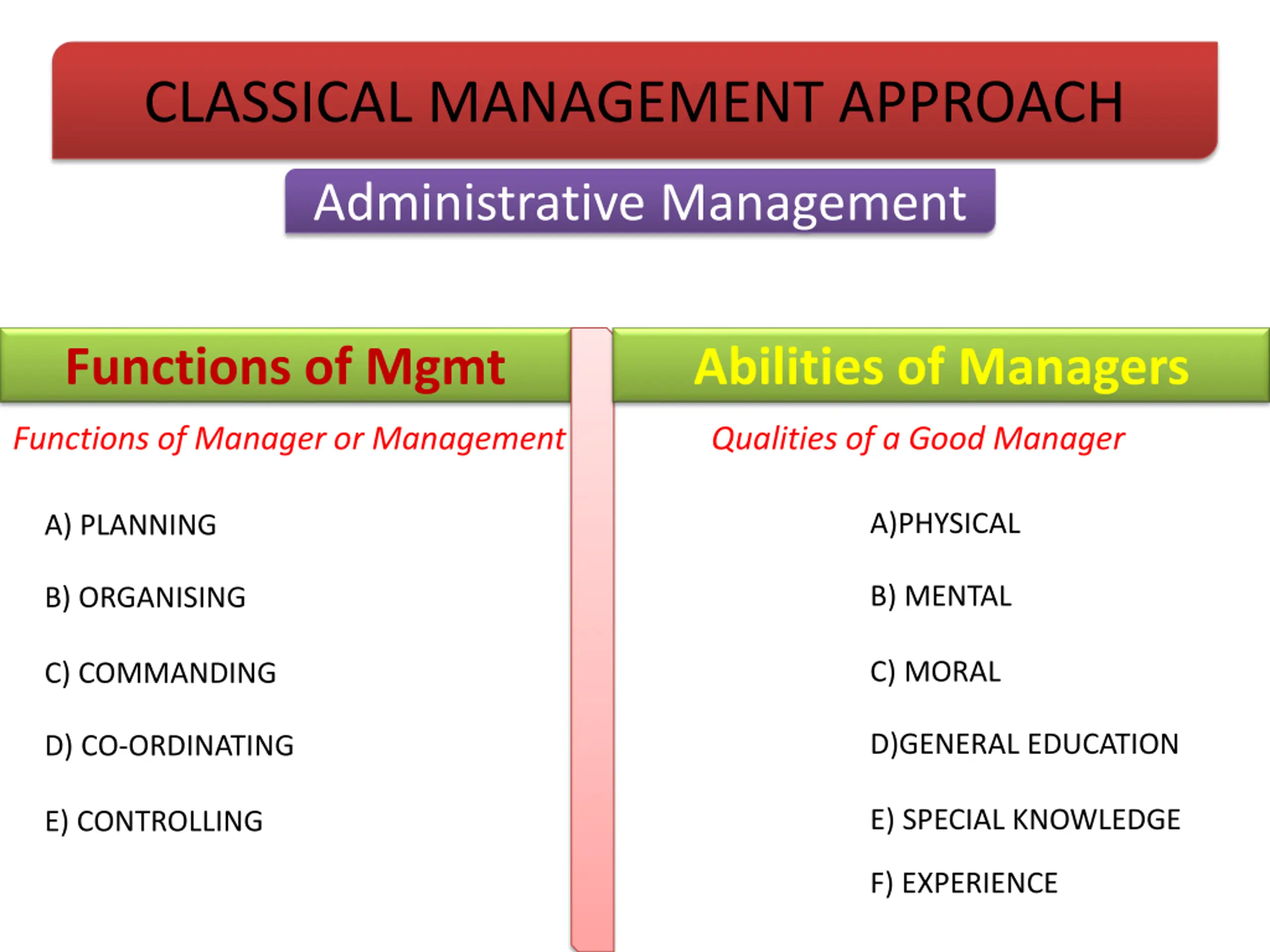 CLASSICAL MANAGEMENT APPROACH Administrative Management Functions of Mgmt Abilities of Managers Functions of Manager or Management Qualities of a Good Manager A)PHYSICAL A) PLANNING B) MENTAL B) ORGANISING C) MORAL C) COMMANDING D)GENERAL EDUCATION D) CO-ORDINATING E) SPECIAL KNOWLEDGE E) CONTROLLING F) EXPERIENCE