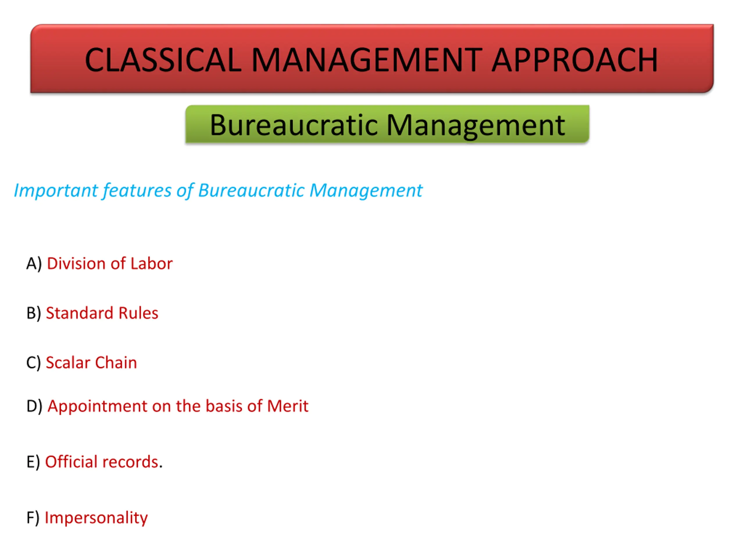 CLASSICAL MANAGEMENT APPROACH Bureaucratic Management Important features of Bureaucratic Management A) Division of Labor B) Standard Rules C) Scalar Chain D) Appointment on the basis of Merit E) Official records. F) Impersonality