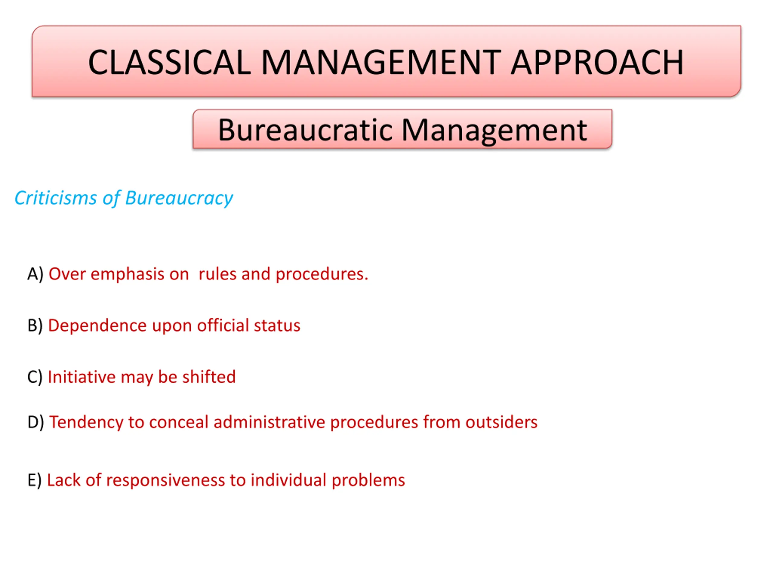 CLASSICAL MANAGEMENT APPROACH Bureaucratic Management Criticisms of Bureaucracy A) Over emphasis on rules and procedures. B) Dependence upon official status C) Initiative may be shifted D) Tendency to conceal administrative procedures from outsiders E) Lack of responsiveness to individual problems