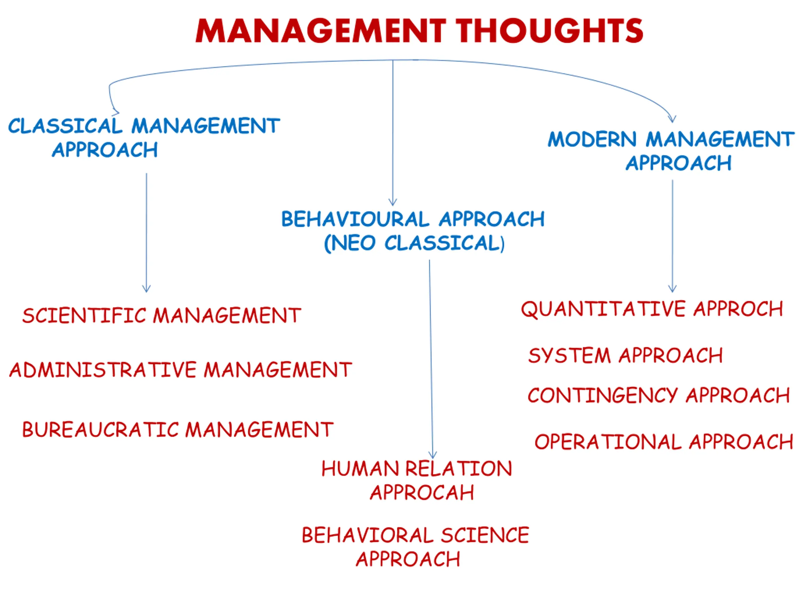 MANAGEMENT THOUGHTS CLASSICAL MANAGEMENT APPROACH MODERN MANAGEMENT APPROACH BEHAVIOURAL APPROACH (NEO CLASSICAL) QUANTITATIVE APPROCH SCIENTIFIC MANAGEMENT SYSTEM APPROACH ADMINISTRATIVE MANAGEMENT CONTINGENCY APPROACH BUREAUCRATIC MANAGEMENT OPERATIONAL APPROACH HUMAN RELATION APPROCAH BEHAVIORAL SCIENCE APPROACH
