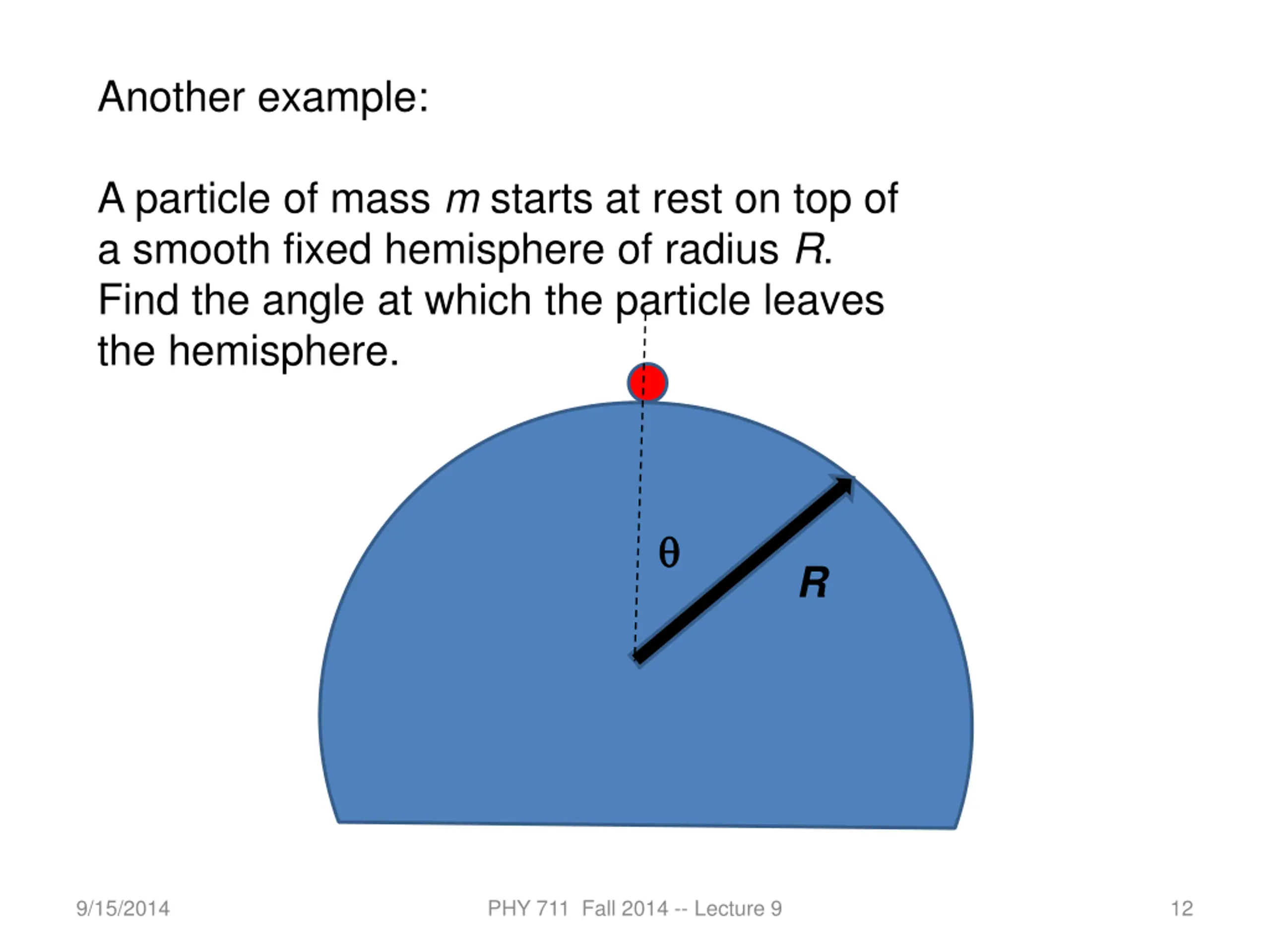Another example: A particle of mass m starts at rest on top of a smooth fixed hemisphere of radius R. Find the angle at which the particle leaves the hemisphere. R 9/15/2014 PHY 711 Fall 2014 -- Lecture 9 12