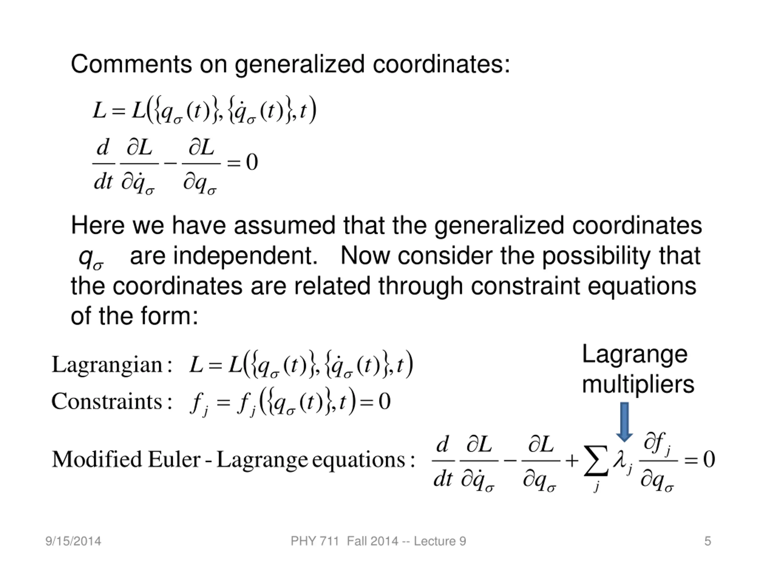 Comments on generalized coordinates: ( , ) q ) = ( ( , ) t L L q t q t d L L = 0 dt q Here we have assumed that the generalized coordinates q are independent. Now consider the possibility that the coordinates are related through constraint equations of the form: ( ( ) 0 , ) ( : s Constraint = = j j t t q f f Lagrange multipliers ) = Lagrangian : ( , ) t ( , ) t L L q q t f d L L j j + = Modified Euler - Lagrange equations : 0 j dt q q q 9/15/2014 PHY 711 Fall 2014 -- Lecture 9 5