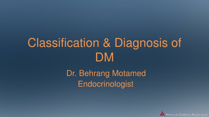An overview of the classification and diagnosis of diabetes mellitus (DM) as presented by Dr. Behrang Motamed, an endocrinologist. Explore the criteria, types, and recommendations for diagnosing DM and prediabetes.