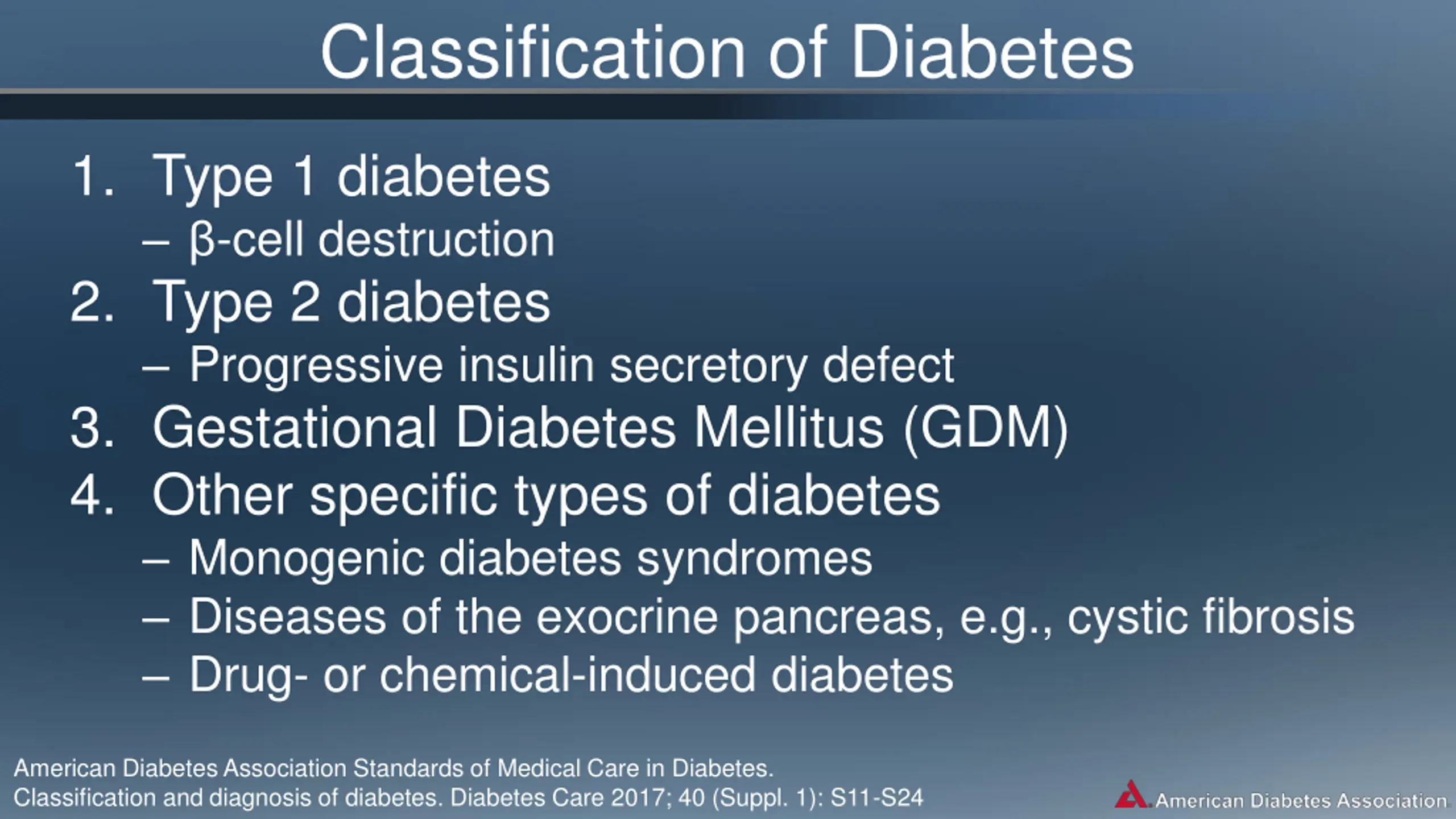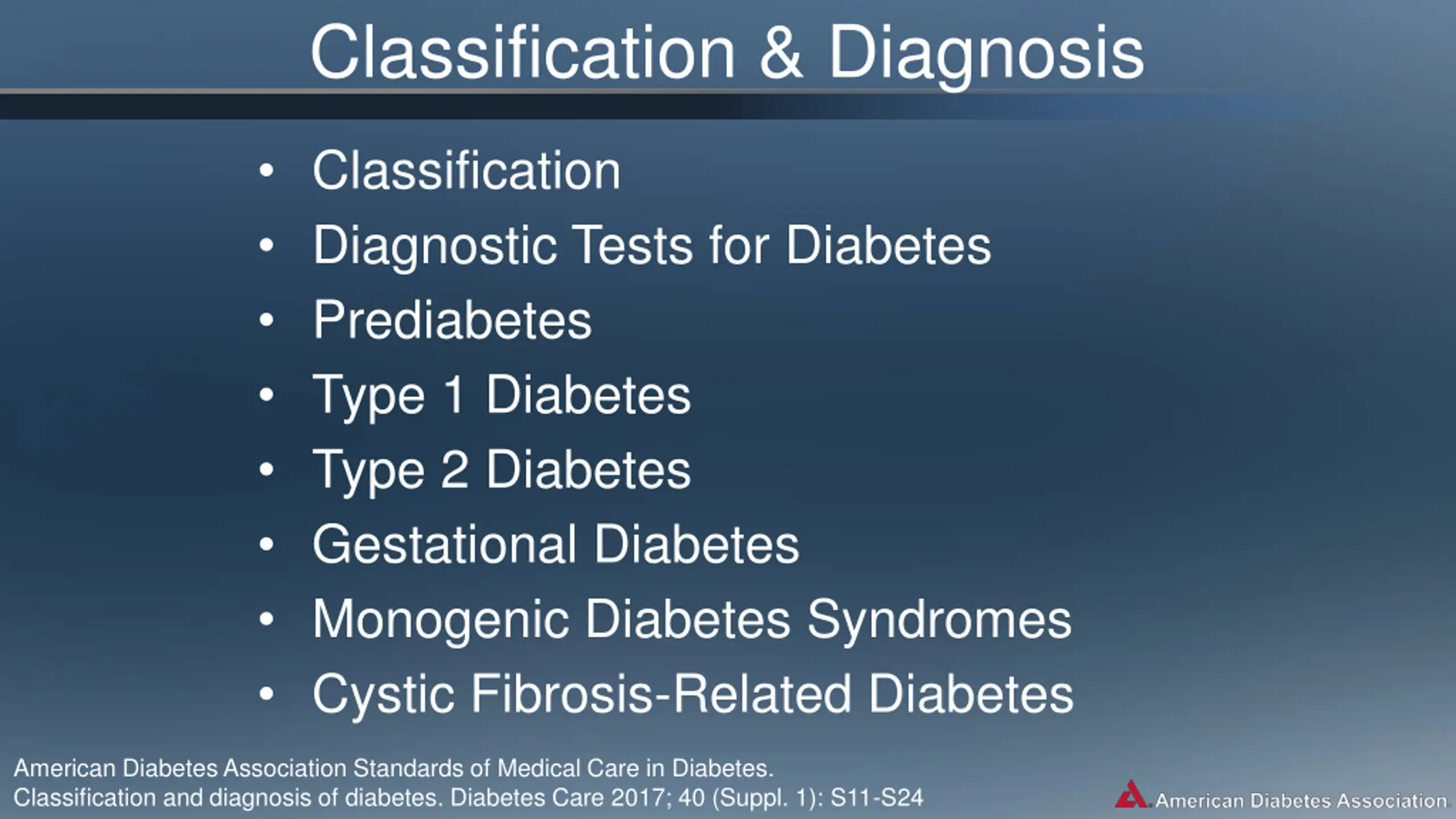 Classification & Diagnosis Classification Diagnostic Tests for Diabetes Prediabetes Type 1 Diabetes Type 2 Diabetes Gestational Diabetes Monogenic Diabetes Syndromes Cystic Fibrosis-Related Diabetes American Diabetes Association Standards of Medical Care in Diabetes. Classification and diagnosis of diabetes. Diabetes Care 2017; 40 (Suppl. 1): S11-S24