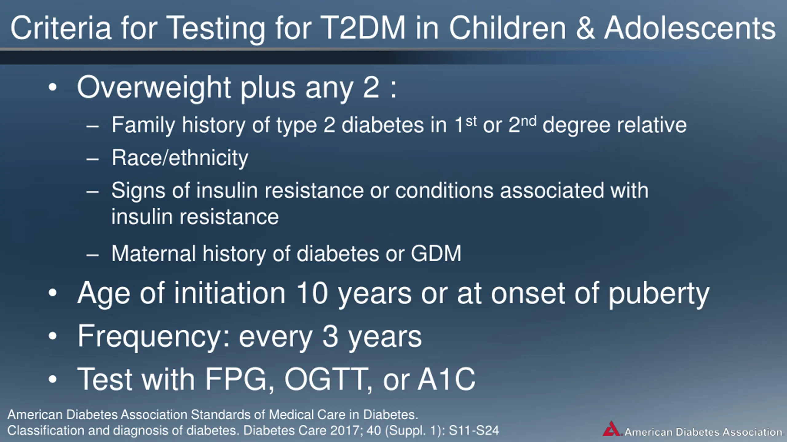 Criteria for Testing for T2DM in Children & Adolescents Overweight plus any 2 : Family history of type 2 diabetes in 1st or 2nd degree relative Race/ethnicity Signs of insulin resistance or conditions associated with insulin resistance Maternal history of diabetes or GDM Age of initiation 10 years or at onset of puberty Frequency: every 3 years Test with FPG, OGTT, or A1C American Diabetes Association Standards of Medical Care in Diabetes. Classification and diagnosis of diabetes. Diabetes Care 2017; 40 (Suppl. 1): S11-S24