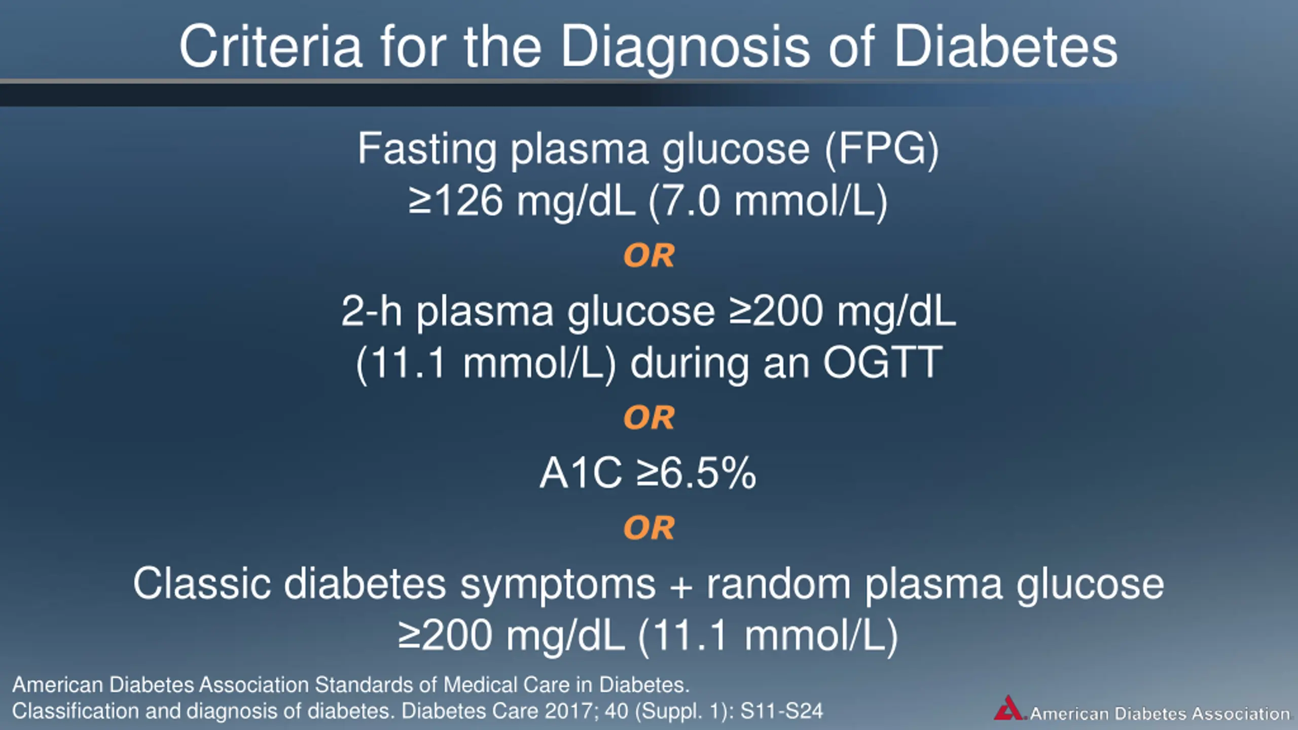 Criteria for the Diagnosis of Diabetes Fasting plasma glucose (FPG) 126 mg/dL (7.0 mmol/L) OR 2-h plasma glucose 200 mg/dL (11.1 mmol/L) during an OGTT OR A1C 6.5% OR Classic diabetes symptoms + random plasma glucose 200 mg/dL (11.1 mmol/L) American Diabetes Association Standards of Medical Care in Diabetes. Classification and diagnosis of diabetes. Diabetes Care 2017; 40 (Suppl. 1): S11-S24