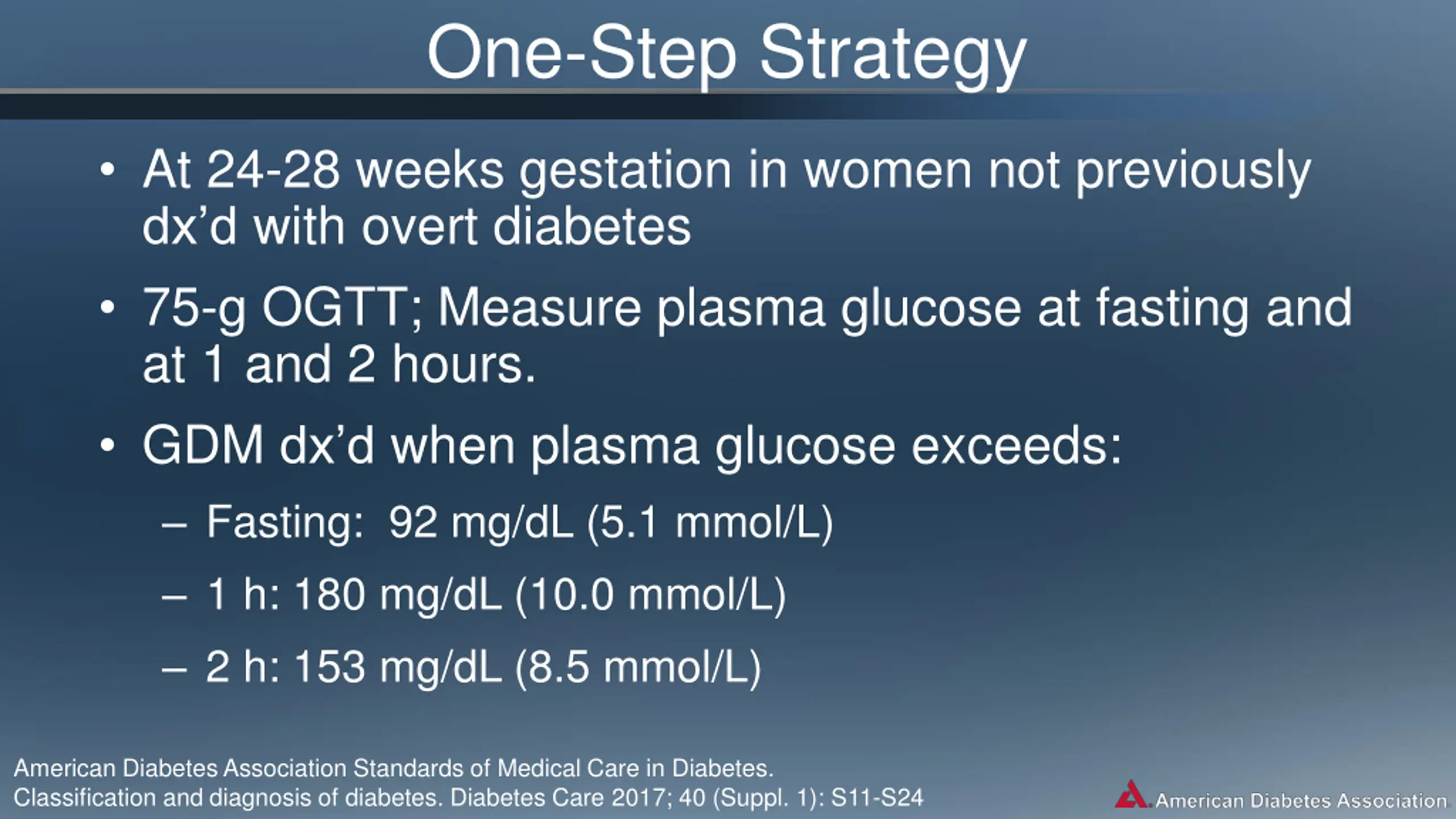 One-Step Strategy At 24-28 weeks gestation in women not previously dx d with overt diabetes 75-g OGTT; Measure plasma glucose at fasting and at 1 and 2 hours. GDM dx d when plasma glucose exceeds: Fasting: 92 mg/dL (5.1 mmol/L) 1 h: 180 mg/dL (10.0 mmol/L) 2 h: 153 mg/dL (8.5 mmol/L) American Diabetes Association Standards of Medical Care in Diabetes. Classification and diagnosis of diabetes. Diabetes Care 2017; 40 (Suppl. 1): S11-S24