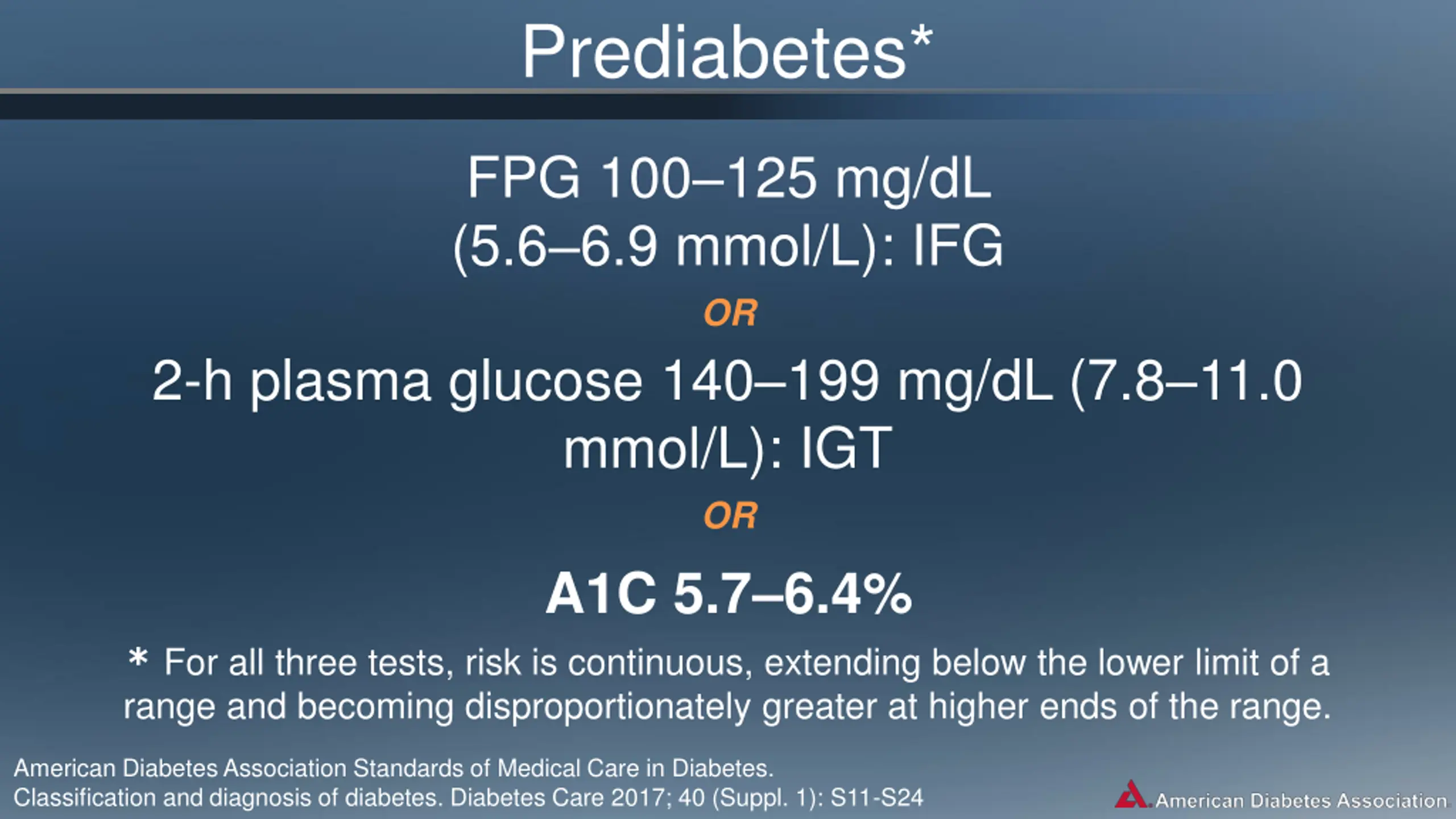 Prediabetes* FPG 100 125 mg/dL (5.6 6.9 mmol/L): IFG OR 2-h plasma glucose 140 199 mg/dL (7.8 11.0 mmol/L): IGT OR A1C 5.7 6.4% * For all three tests, risk is continuous, extending below the lower limit of a range and becoming disproportionately greater at higher ends of the range. American Diabetes Association Standards of Medical Care in Diabetes. Classification and diagnosis of diabetes. Diabetes Care 2017; 40 (Suppl. 1): S11-S24