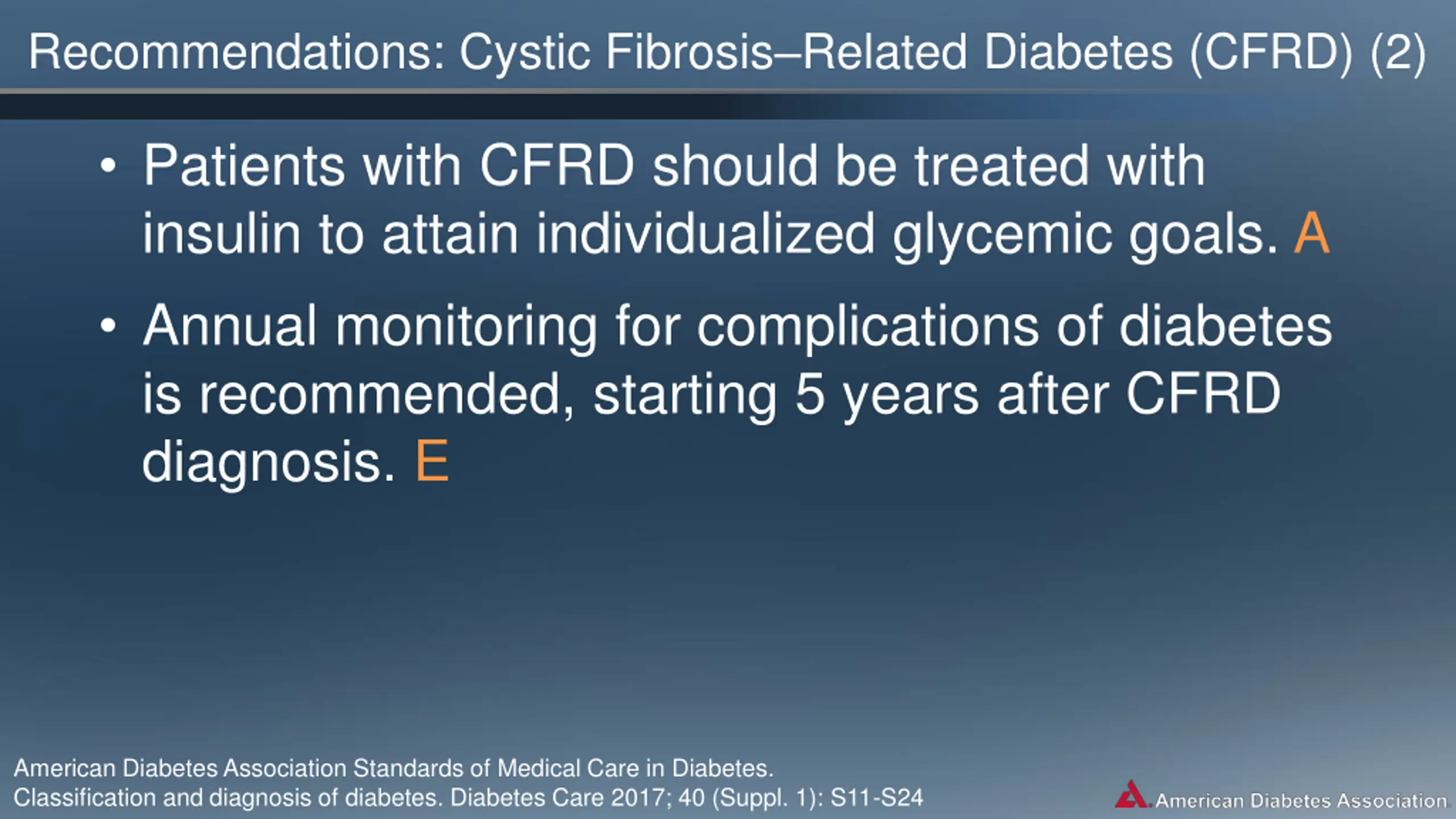 Recommendations: Cystic FibrosisRelated Diabetes (CFRD) (2) Patients with CFRD should be treated with insulin to attain individualized glycemic goals. A Annual monitoring for complications of diabetes is recommended, starting 5 years after CFRD diagnosis. E American Diabetes Association Standards of Medical Care in Diabetes. Classification and diagnosis of diabetes. Diabetes Care 2017; 40 (Suppl. 1): S11-S24