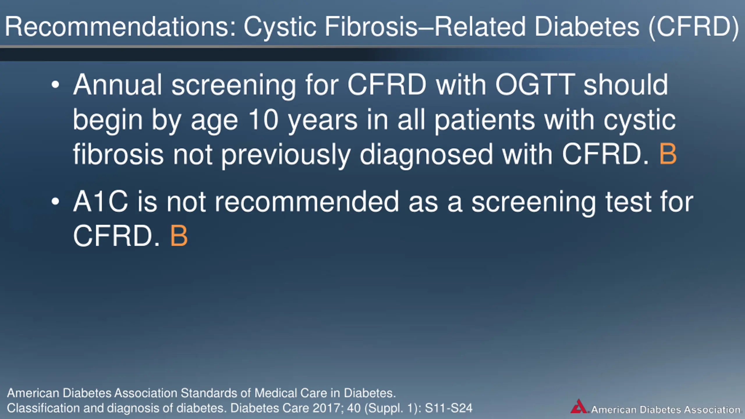 Recommendations: Cystic FibrosisRelated Diabetes (CFRD) Annual screening for CFRD with OGTT should begin by age 10 years in all patients with cystic fibrosis not previously diagnosed with CFRD. B A1C is not recommended as a screening test for CFRD. B American Diabetes Association Standards of Medical Care in Diabetes. Classification and diagnosis of diabetes. Diabetes Care 2017; 40 (Suppl. 1): S11-S24