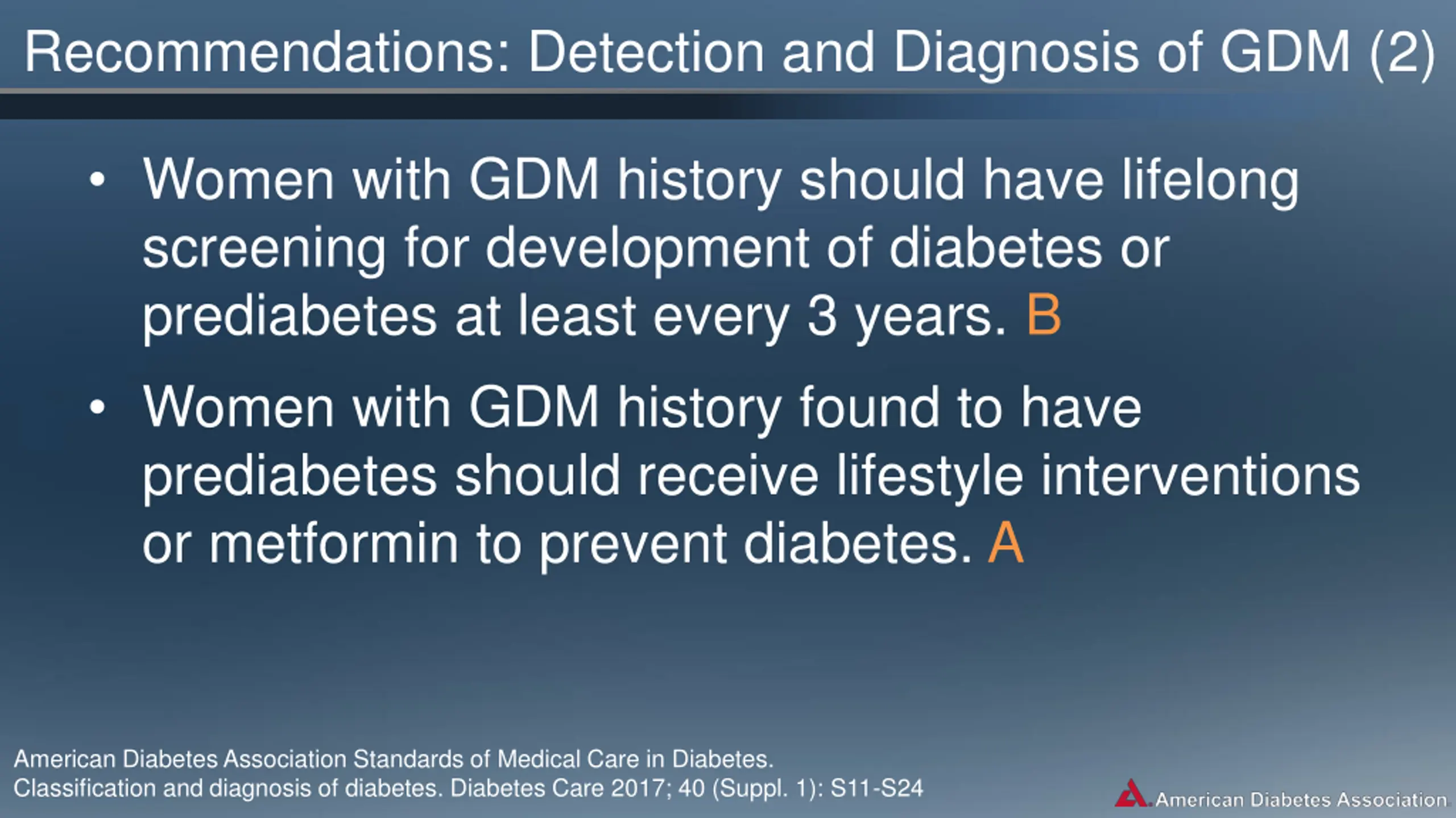 Recommendations: Detection and Diagnosis of GDM (2) Women with GDM history should have lifelong screening for development of diabetes or prediabetes at least every 3 years. B Women with GDM history found to have prediabetes should receive lifestyle interventions or metformin to prevent diabetes. A American Diabetes Association Standards of Medical Care in Diabetes. Classification and diagnosis of diabetes. Diabetes Care 2017; 40 (Suppl. 1): S11-S24