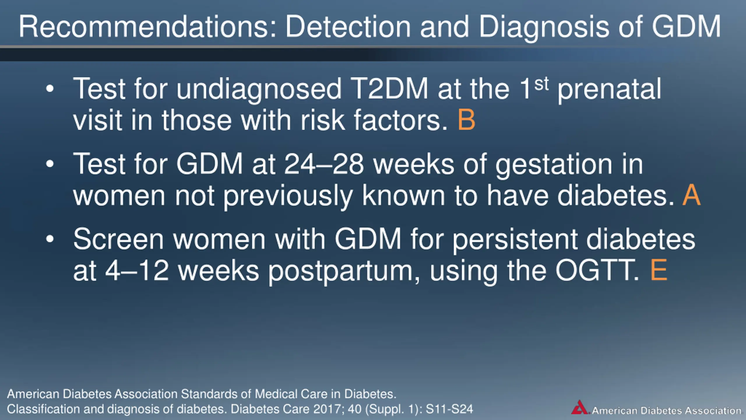 Recommendations: Detection and Diagnosis of GDM Test for undiagnosed T2DM at the 1st prenatal visit in those with risk factors. B Test for GDM at 24 28 weeks of gestation in women not previously known to have diabetes. A Screen women with GDM for persistent diabetes at 4 12 weeks postpartum, using the OGTT. E American Diabetes Association Standards of Medical Care in Diabetes. Classification and diagnosis of diabetes. Diabetes Care 2017; 40 (Suppl. 1): S11-S24